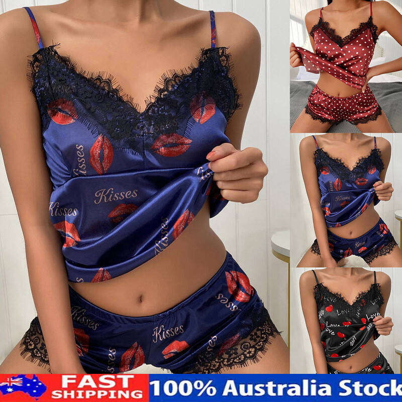 Specification: Item Name: Women Satin Lace Short Pajama Set Gender: Women Occasion:Sexy Style:Casual ,Minimalist Material: Imitated Silk Popular Element:Lace Top Length:Regula Neckline:V-Neck Sleeve Length:Sleeveless Color: Black, Red, Blue Style: Solid Color Season: Spring, Summer, Autumn Waist:Natural Fit Type:Casual Size Type:Regular Size: S-XXXL, As pictures shown Garment Care:Hand Wash,Machine Washable