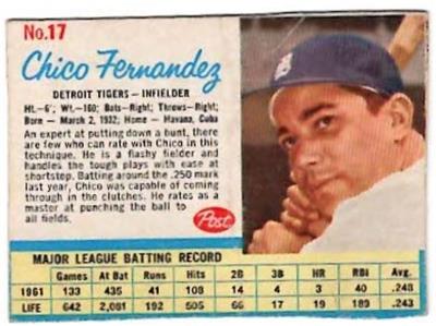 Here's a 1962 Post Cereal of Detroit Tigers star Chico Fernandez. Card #17 is in vg shape with a crease.