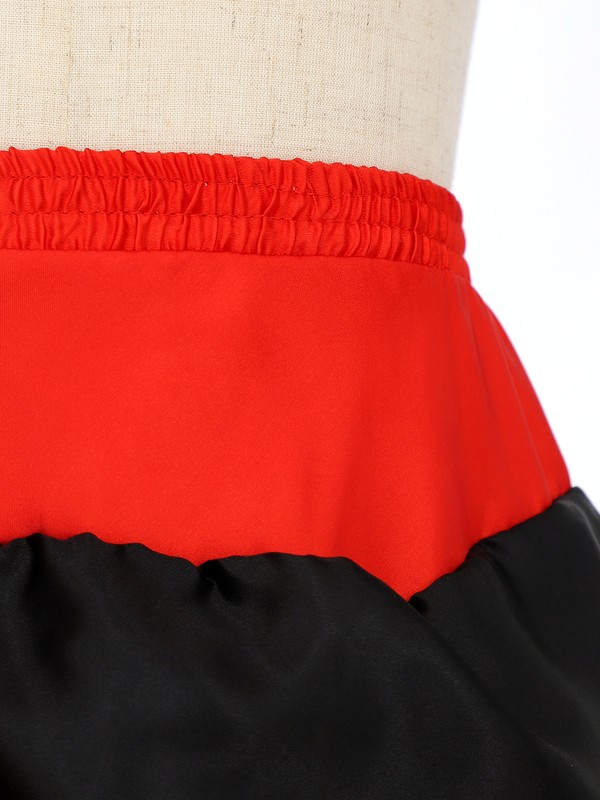 Designed with high waist, tiered skirt with bright red, gold and black color contrast pastchwork.