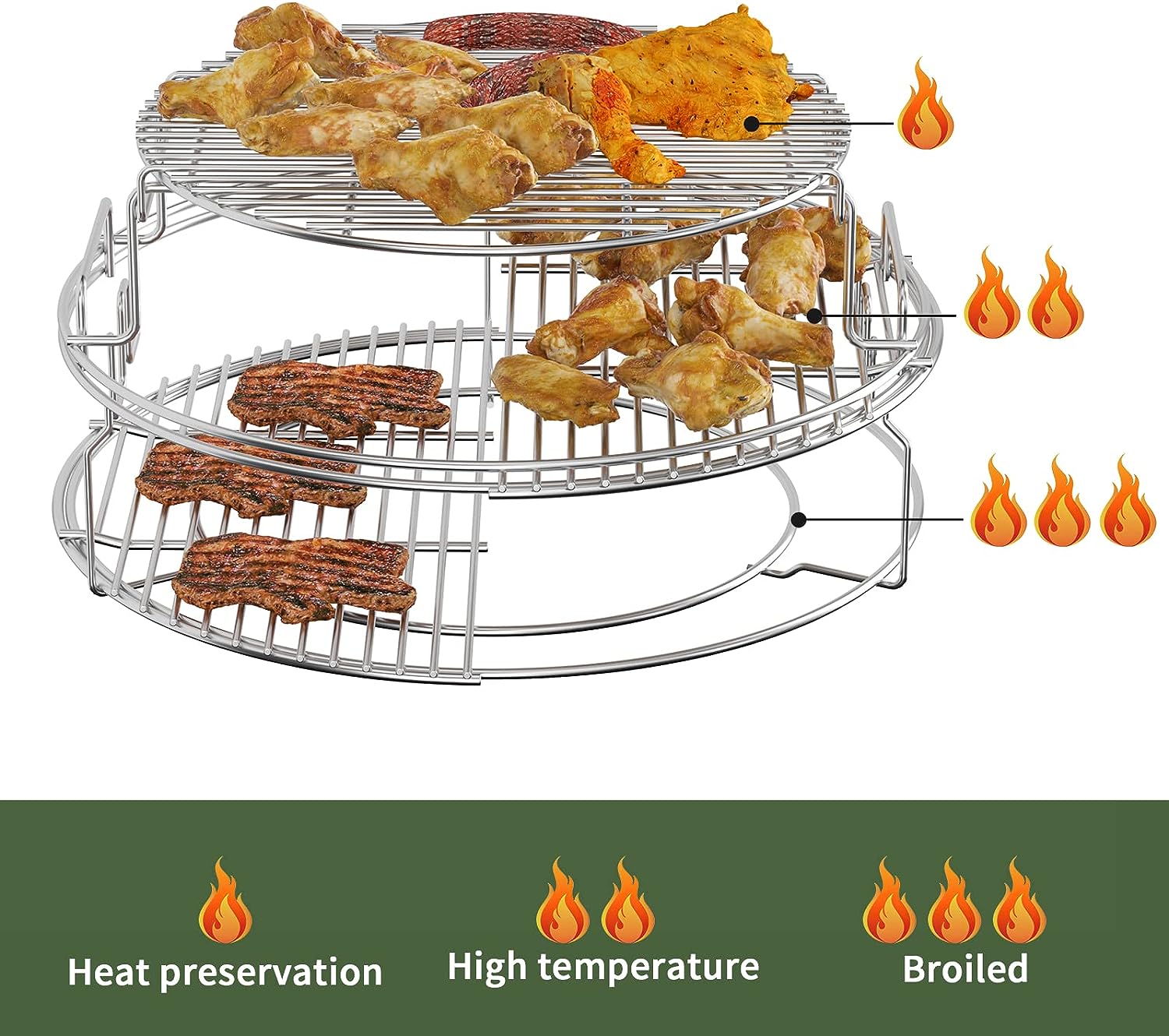 【5 Piece Kit for 18" Large Big Green Egg】Our Big Green Egg Replacement Kit can be divided into three layers at most. The bottom layer is broiled(as beef steak), the middle layer is high temperature (as sausage), and the top layer is heat preservation (as vegetables)