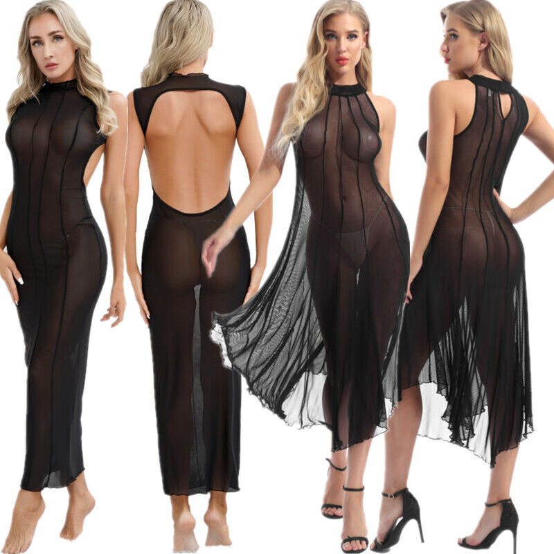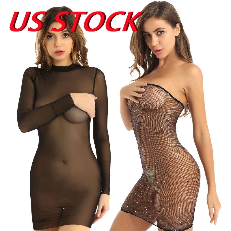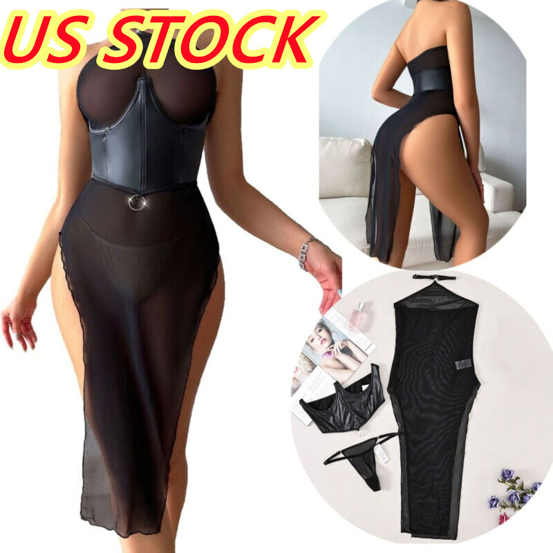 Lingerie set includes mini dress and thong. Dress is designed with adjustable straps, deep v neck, see-through lace bra and front zipper.