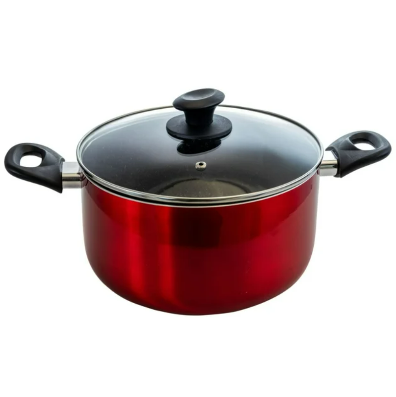 The Gibson Merrion 6 Quart Aluminum Dutch Oven with Glass Lid in Red lets you Whip up delicious meals for your family and friends. The non-stick coated interior allows for healthier cooking as it requires little to no fat, and the food will slide right off the pot, making cleaning a breeze. The Bakelite handles remain cool to the touch to prevent burns and scalds. For added convenience, you can quickly monitor the cooking process through the vented tempered glass lids. Item Dimensions: 15.25" x 9.50" x 5.25"Item Weight: 3.65lbs