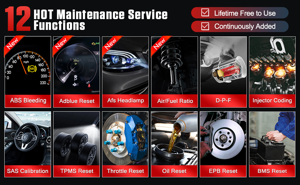 12 Servicefunktionen: Öllampen-Reset, Elektrischer Feststellbremsen-Reset, Batteriemanagement-System-Reset, Lenkwinkelsensor-Reset, Dieselpartikelfilter-Reset, Injektor-Programmierung, Drosselklappenanpassung,TPMS-Reset...etc.