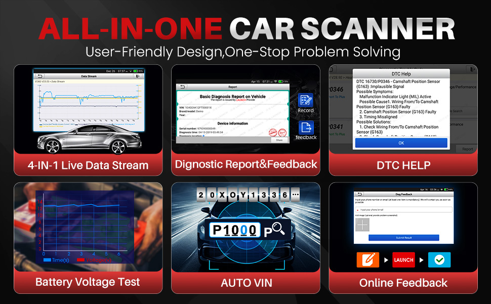 Professional 4 System diagnosegerät: Fehlercodes auslesen und löschen von 4 Systemen: Motor, Automatikgetriebe, ABS und SRS-Airbag; Sie können alle Fehlercodes lesen und Live-Datenströme anzeigen.LAUNCH CRP129E V3.0 auto diagnose scan tool sondern auch automatisch einen Fahrzeugstatusbericht für Sie erstellen.