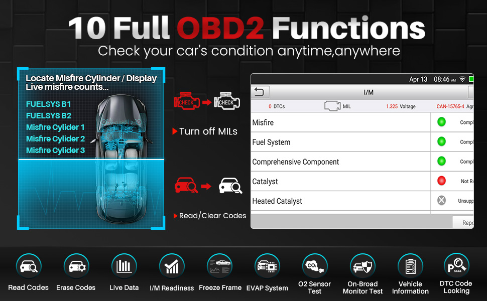 4. Motor: Gerät, das das Automobil und das Herz des Automobils mit Strom versorgt. Es bestimmt die Leistung, Wirtschaftlichkeit, Stabilität des Automobils. Im Gegensatz zu anderen Marken Scanner nur für 2005 und neuere Autos. LAUNCH CRP129E V3.0 Unterstützung OBD1 / OBD2 / EOBD Autos von 1996 bis jetzt. Es unterstützt 10 Modi obdii Funktionen und Echtzeit-Batteriespannung in Wavegraph