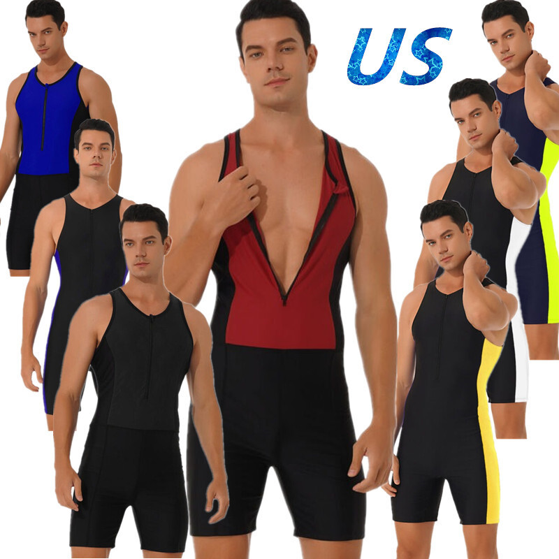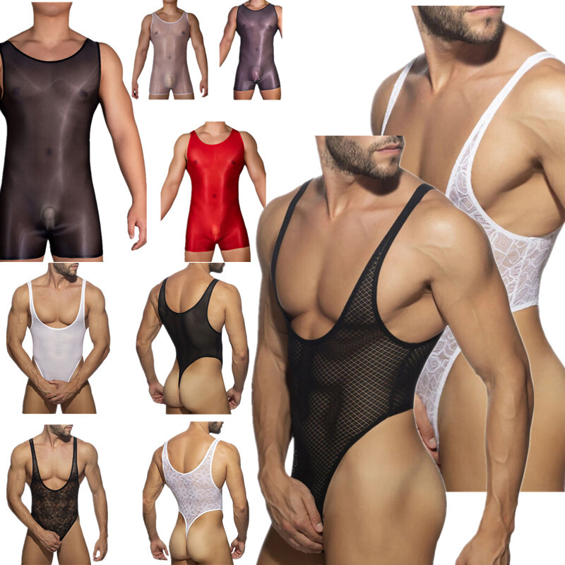 Mens Solid Color Glossy One-piece Swimsuit Cutout Back Bodysuit Leotard Swimwear.