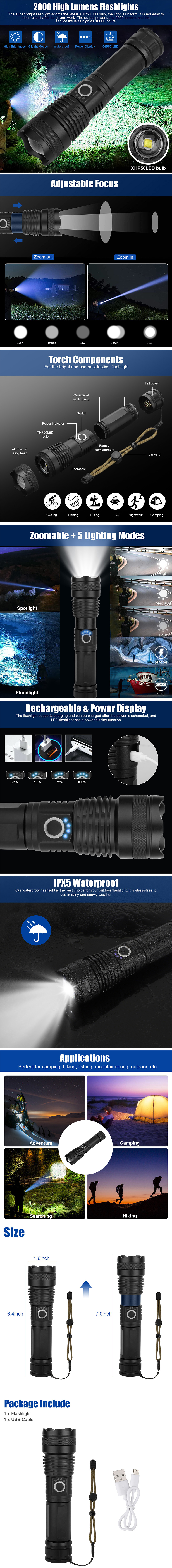 | Features | 2000 Lumens, 5 Light Modes, Telescopic Zoom, USB Rechargeable, Power Display, IPX5 Waterproof, Portable & Handheld |