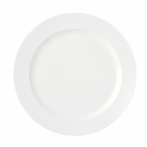 The Oneida L5800000163 is a 12 inch diameter plate made from warm white porcelain. It features a rolled edge for added durability and a classic look. The warm white color provides a neutral backdrop for your food presentation, and it is made from lead and cadmium-free materials for safety.