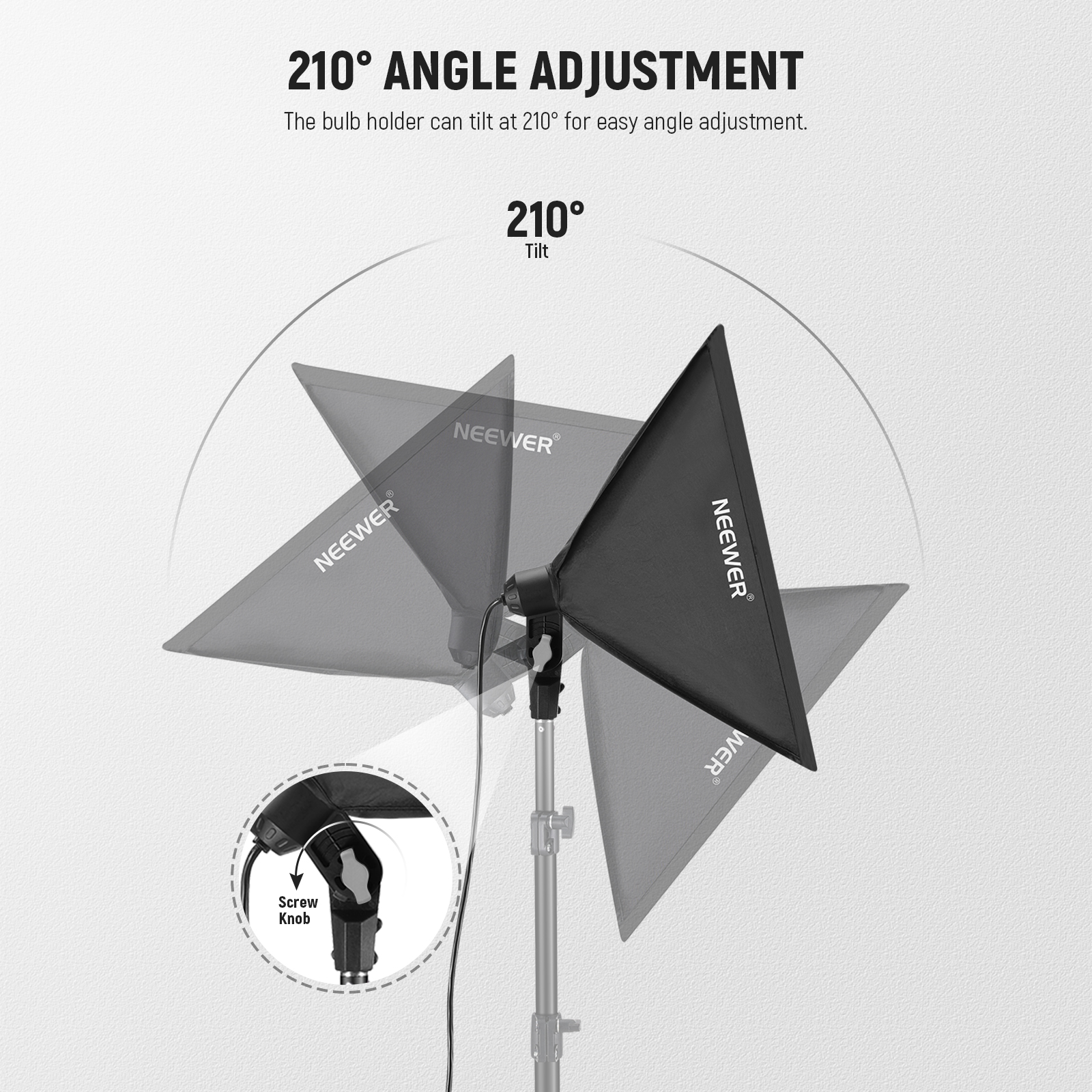 【Soft & Broad Light Output】 A soft light shaper, ideal for portraits, weddings, product photos, and videos. The silver interior ensures neutral color temperature, and the white diffuser creates broad, balanced output and minimizes shadows 【Tough Nylon Construction】 Thick and tough nylon fabric ensures higher durability. Hemmed edges prevent fraying for years of use 【Standard E26 Lamp Socket】 The E26 porcelain lamp socket fits LED, incandescent, and fluorescent light bulbs and resists high temperatures for safe use. It has a UL certified power cable for AC power and a switch for lighting control 【Tilting Light Stand Mount Adapter】 The mount adapter can mount on any light stand with a 5/8" stud and tilt at 210° for angle adjustment 【Straightforward Operation】 With a spring mechanism and four flexible ribs, the softbox can open and close like an umbrella. The diffuser can be easily attached and removed via touch fasteners
