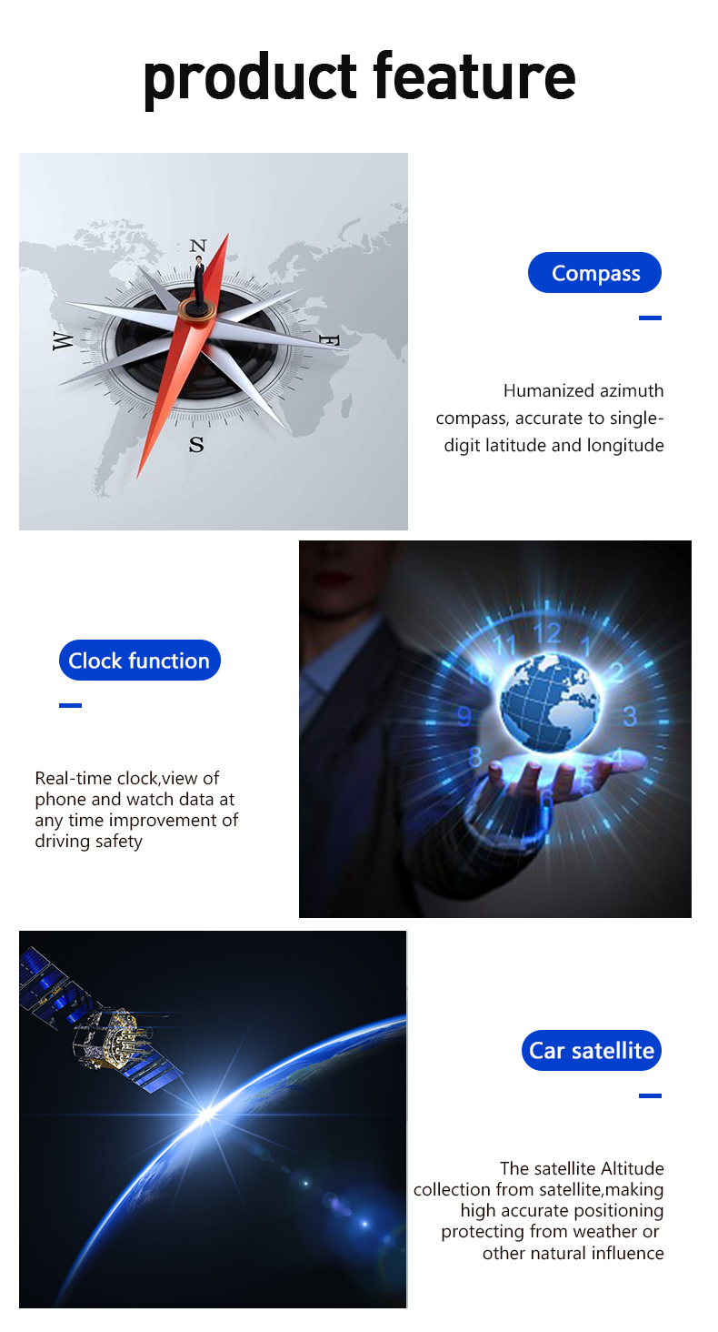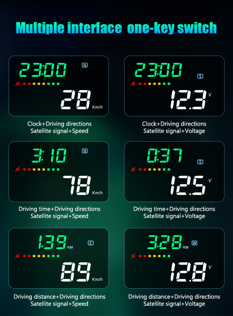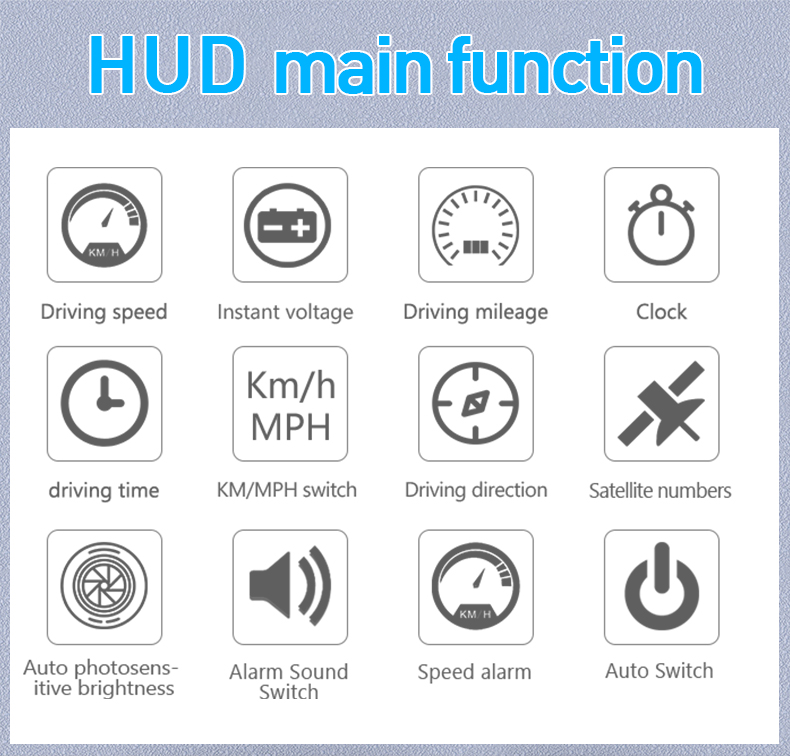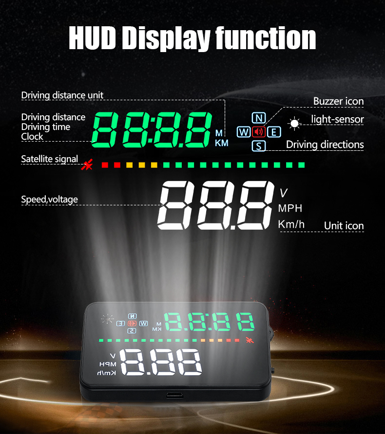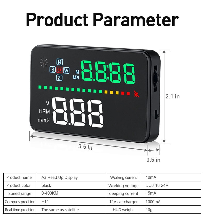 1、Available for any car,easy to install,plug and play 2、Screen 3.5'' HD display 3、Multi-color design makes the screen more abundant and easier to read 4、Nano-technology to eliminate double reflections,more clear 5、Rich Contents:speed,compass,,single driving time and distance,local time,statellite number,altitude,speed alarm,free switch between km and miles 6、Auto power on/off:HUD start and off with vehicle started and shutdown,effective protection of the car battery, retaining the manual switch mode, more easy to control HUD 7、Automatic and manual brightness adjustment mode,driving without glare