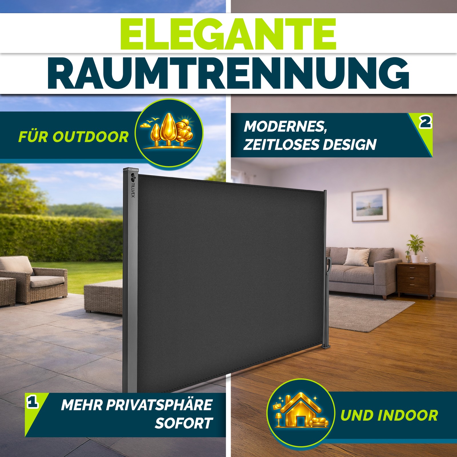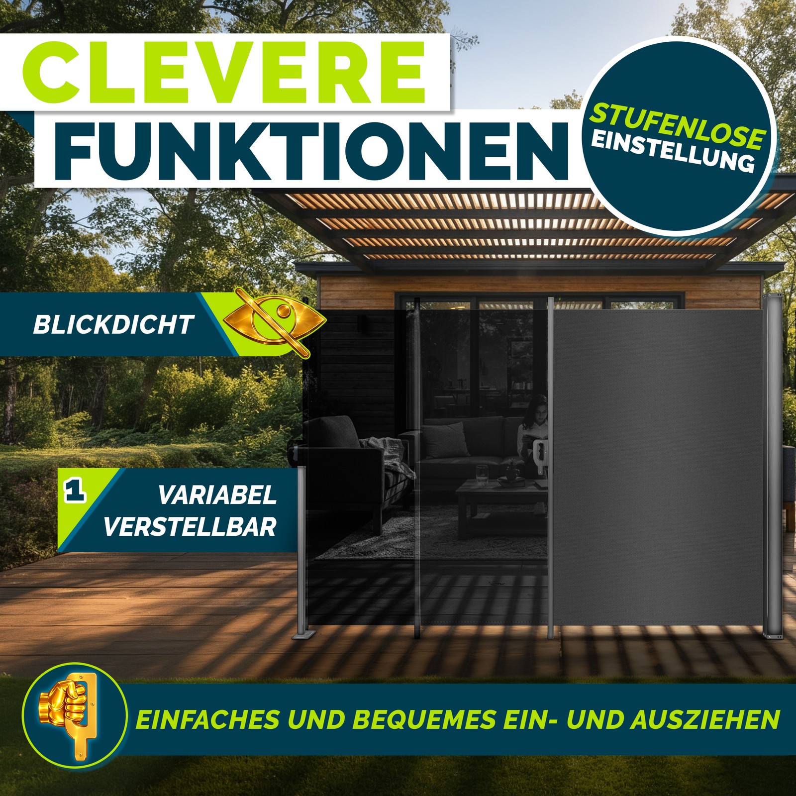 MAXIMALE PRIVATSPHÄRE & SCHUTZ: Unsere großzügige Seitenmarkise schafft eine private Oase auf Ihrem Balkon, Garten oder Terrasse. Genießen Sie ungestörte Momente und schützen Sie sich zuverlässig vor neugierigen Blicken der Nachbarn. Die hochwertige Polyester-Bespannung (220 g/m²) mit wasserabweisender PU-Beschichtung bietet langfristigen Schutz vor Sonne, Regen und UV-Strahlen (UV50+), um Ihre Privatsphäre zu erhalten und Ihre Markise zu schützen.