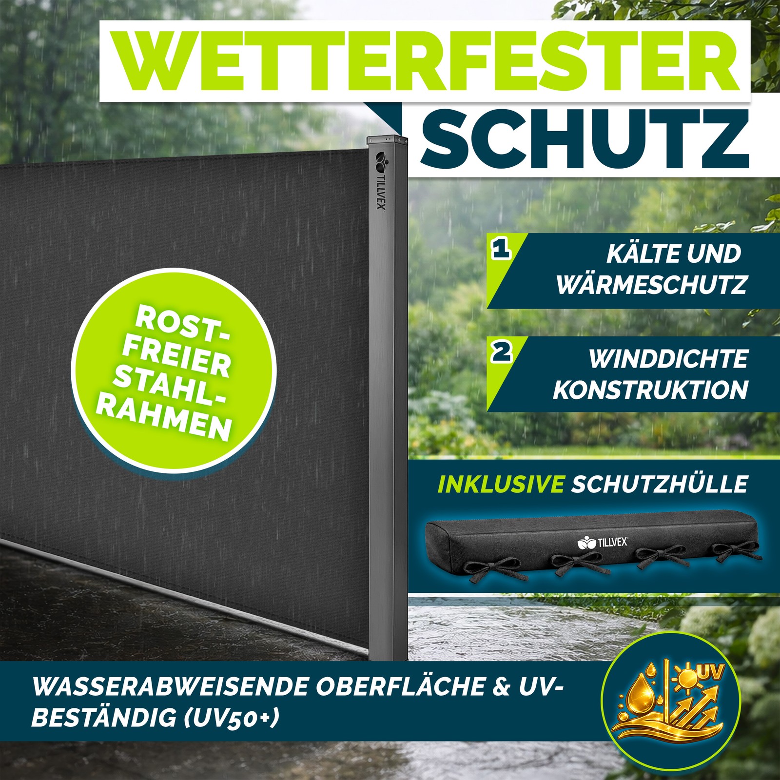 tillvex® Seitenmarkise ausziehbar & blickdicht | Sichtschutz für Balkon, Garten & Terrasse | Seitenrollo mit Wandhalterung | Sonnenschutz aus rostfreiem Stahl | Markise Windschutz