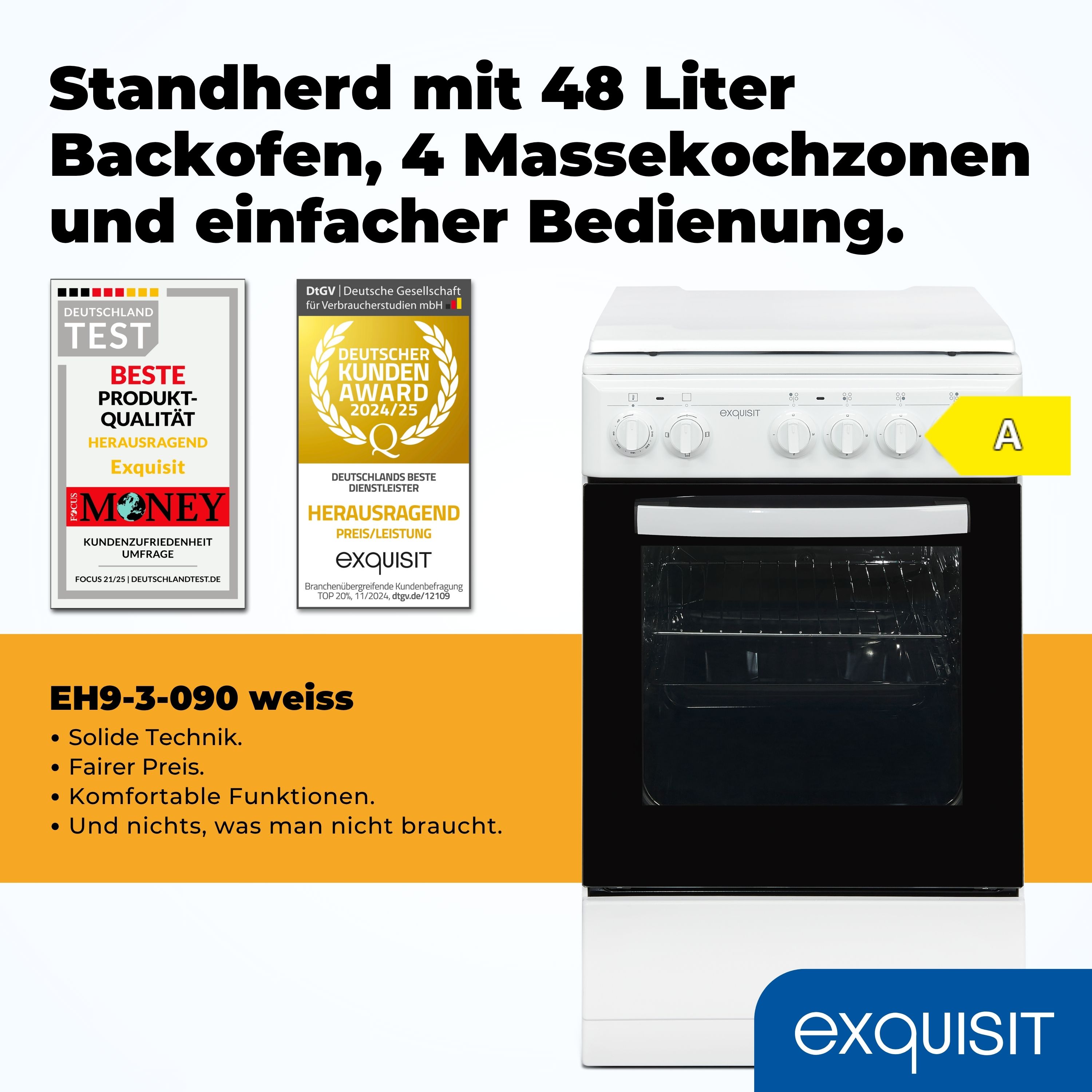 Der Elektro-Standherd EH9-3-090weiss kommt im trendigen Weiß-Design und bietet eine vorzügliche Funktionalität. Durch einen Verbrauch von nur 0,71 kWh/Zyklus erreicht er ein äußerst gutes Ergebnis auf dem Gebiet der Energieeffizienzklassifizierung (A). Die insgesamt 4 höhenverstellbaren Füße (2 vorne, 2 hinten), sorgen für eine variable Positionierung am Wunschort.