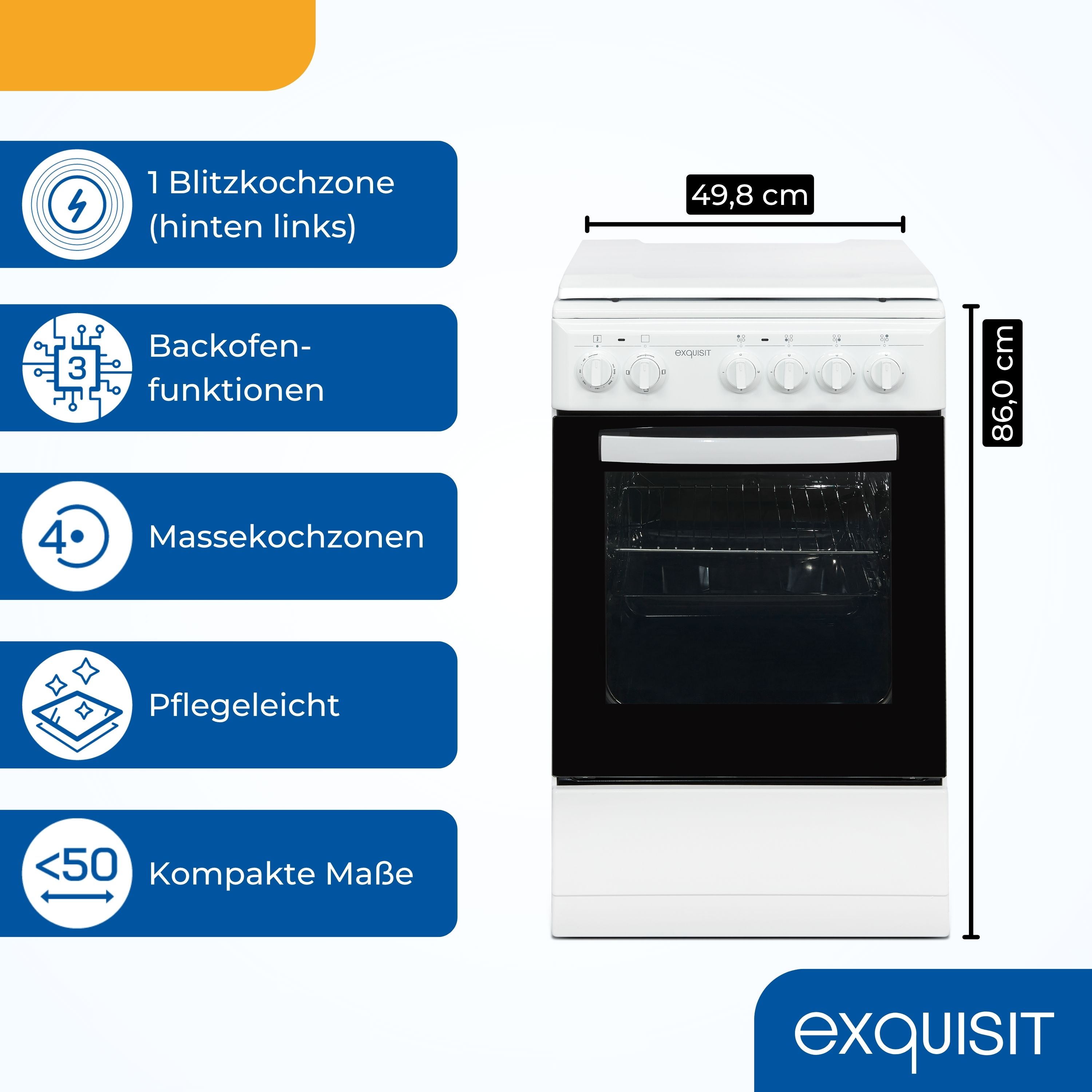 Der Exquisit Elektro-Standherd EH9-3-090 weiss besitzt ein Garraumvolumen von 48 l bei einem Maß von 86,0 x 49,8 x 55,5 cm (HxBxT). Das Tiefenmaß bei offener Tür des Elektro-Standherds beträgt 102,7 cm. Gehalten in Weiß. Der EH9-3-090weiss verfügt über 3 Backofenprogramm und einem Temperaturbereich von 50 - 240 °C. Zudem ist das Gerät mit einer praktischen Beleuchtung ausgestattet, die Ihnen jederzeit einen Blick in den Backofen ermöglicht. Der Elektro-Standherd bietet reichliche Funktionen, darunter: Ober- & Unterhitze, zudem im Lieferumfang: Grillrost & Backblech.