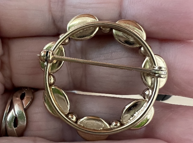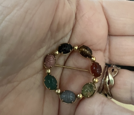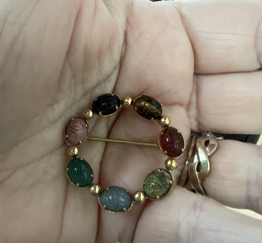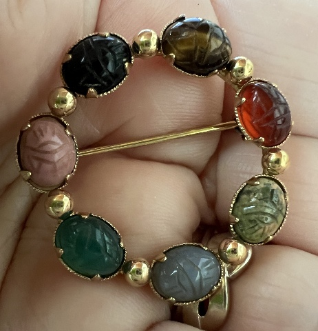 Offered here is a vintage Winard 12k gold filled scarab circle pin measuring 1 1/4" wide featuring, tiger's eye, onyx, unikite, carnelian, pink stone and agate.