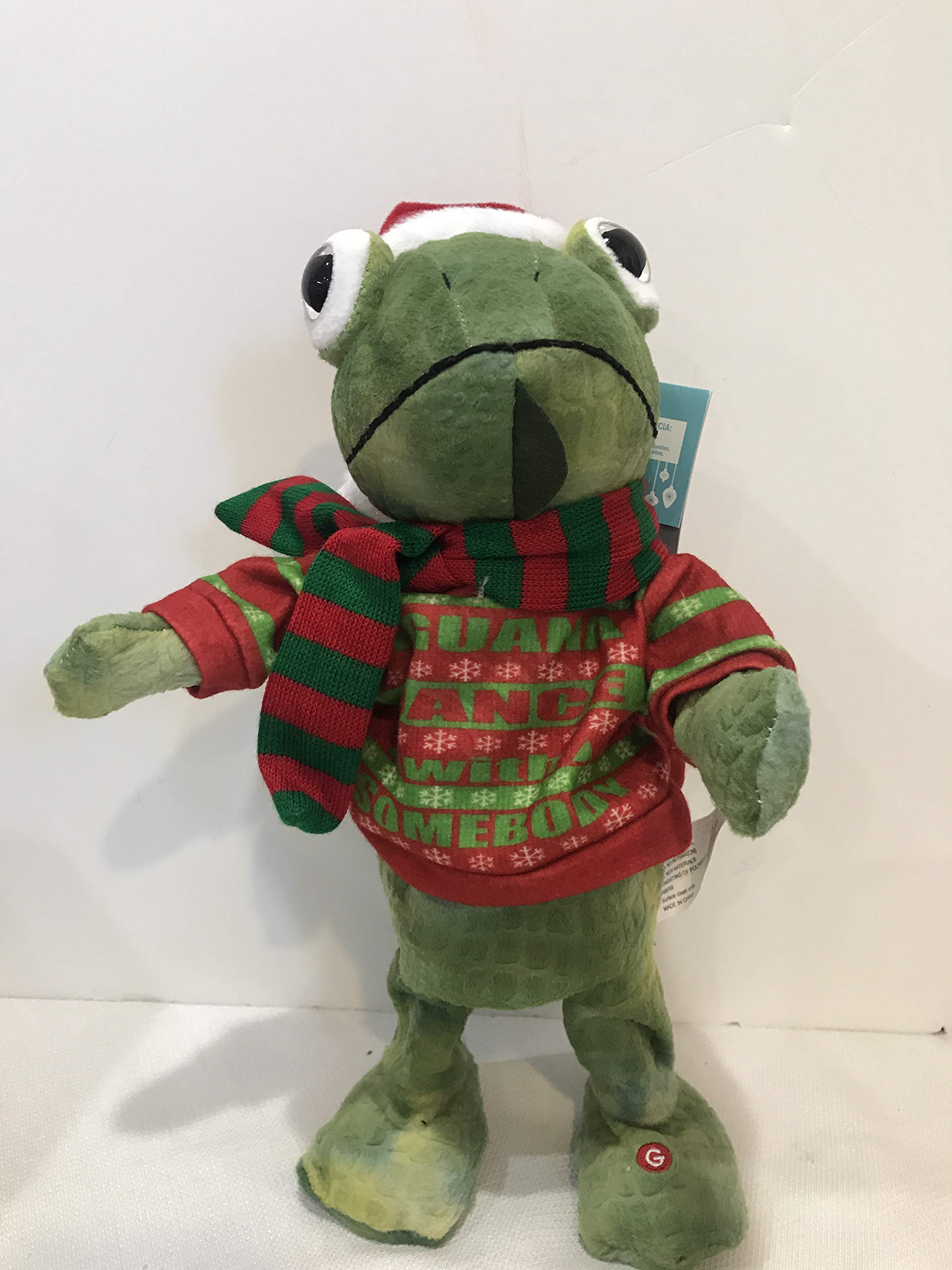 15" Plush Dancing Animated Iguana with Christmas shirt and Santa Hat. Dances to " I Wanna Dance with Somebody"