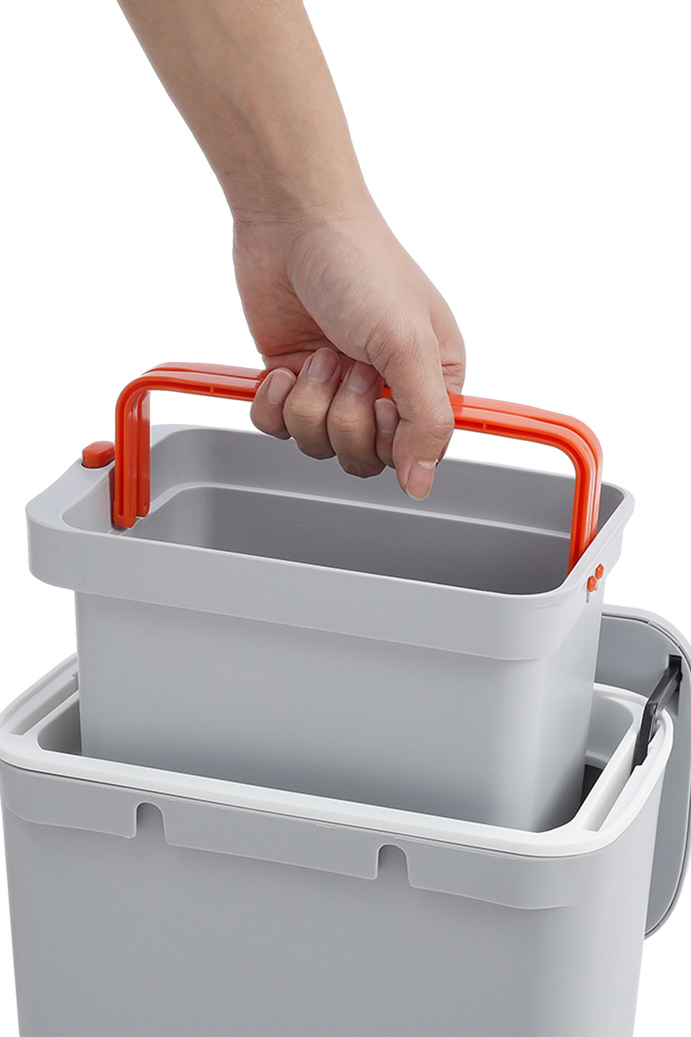 Hanging trash bin cabint on the cabinet door is convenient for dumping veggie peelings, no need to bend over.