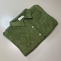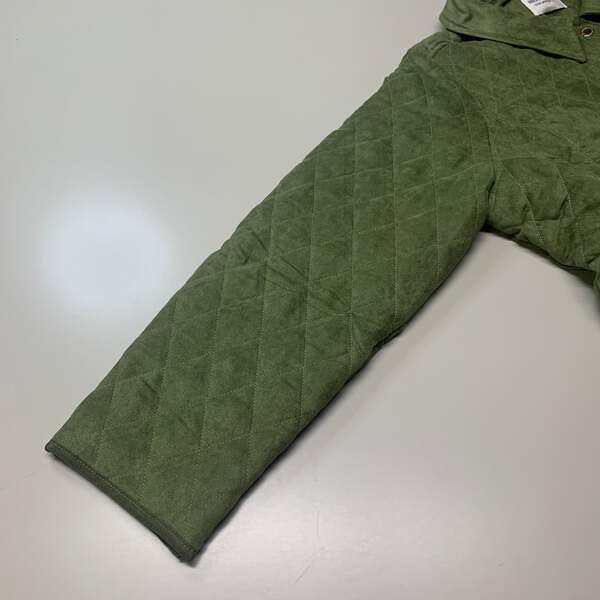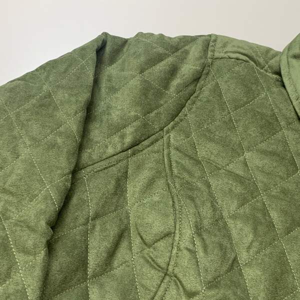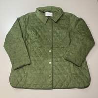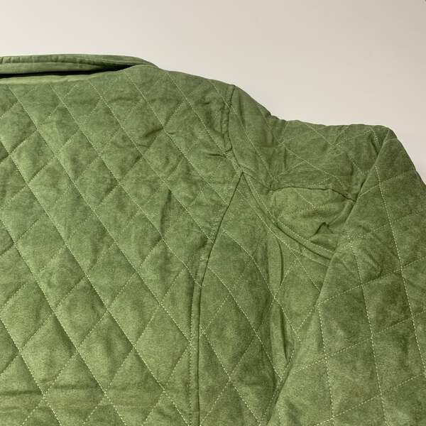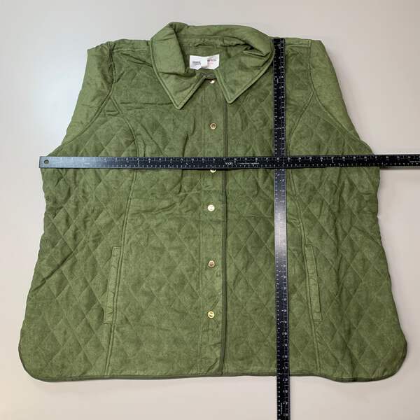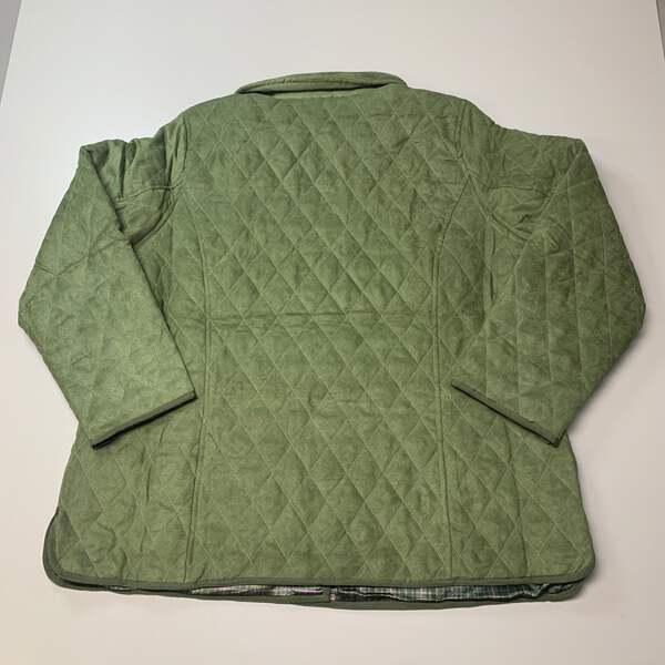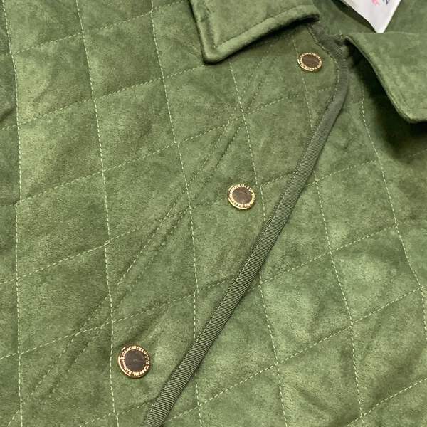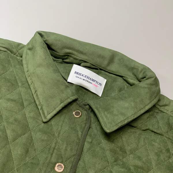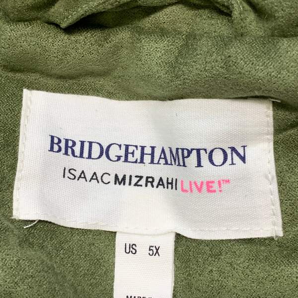BRIDGE HAMPTON ISSAC MIZRAHI LIVE! Faux Suede Coat Full Snap Up Condition: New Size: 5X Color: Basil Outer Layer With a Plaid Pink, Black and Green Inside Layer Description: This Mid-Length Snap Up Jacket is Perfect for Travel and Casual. The Woven Polyester Fabric Ensures Durability With an Elegant Quilted Accent, Pockets, Gold Snap Buttons and a Soft Sleek Plaid Pattern On Inside