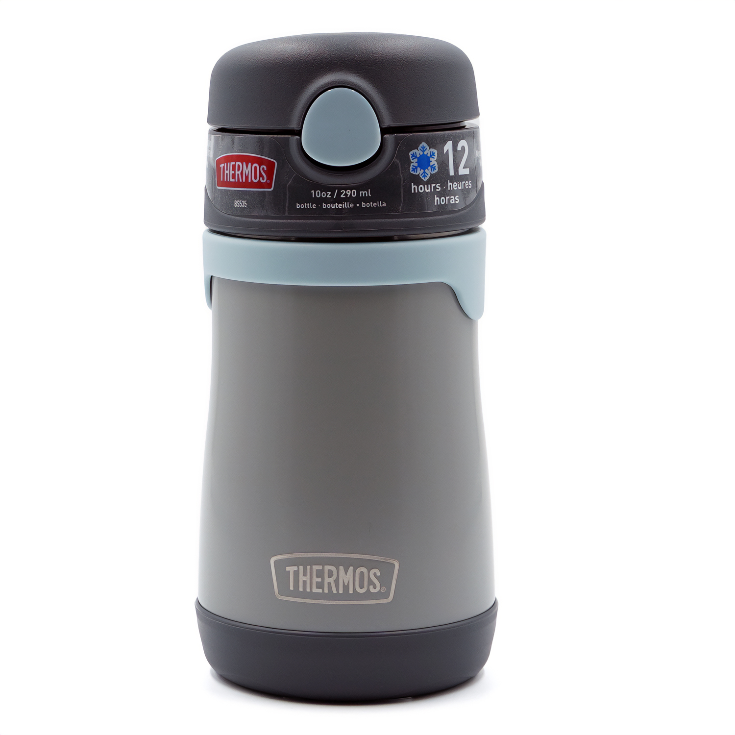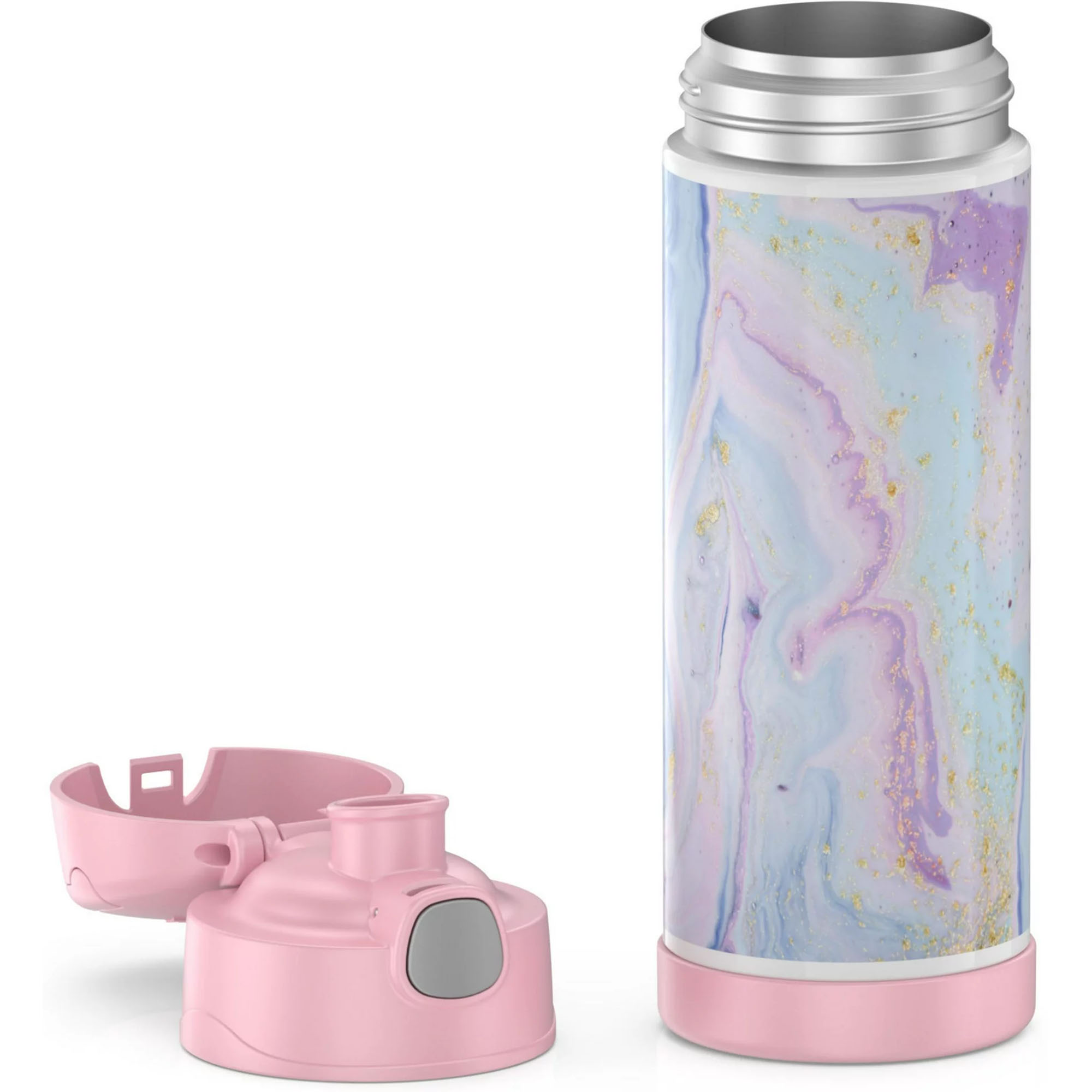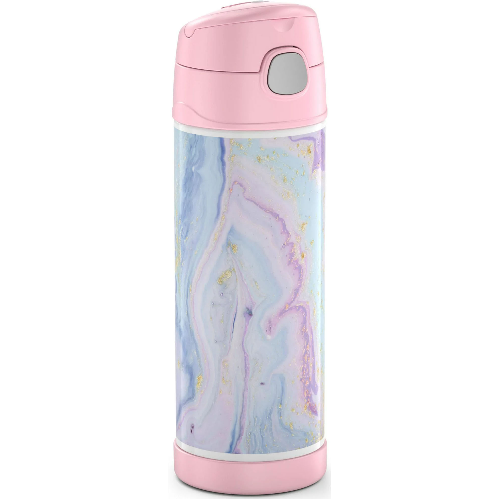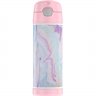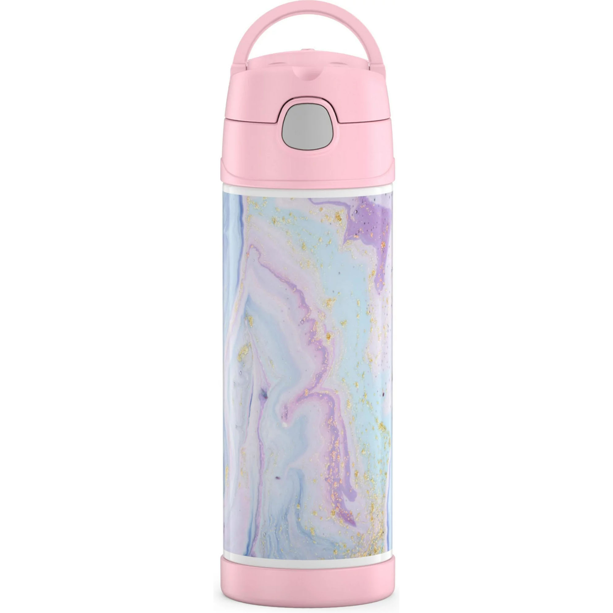 The Thermos 16 oz. Kid's Funtainer Vacuum Insulated Stainless Steel Water Bottle keeps drinks cold for up to 12 hours! Its durable construction is built to handle drops, dings, and assorted roughhousing. It also features an integrated carry handle, making it easy for kids to carry throughout their day. To clean, you can pop your Funtainer Water Bottle in the dishwasher; however washing by hand is recommended.