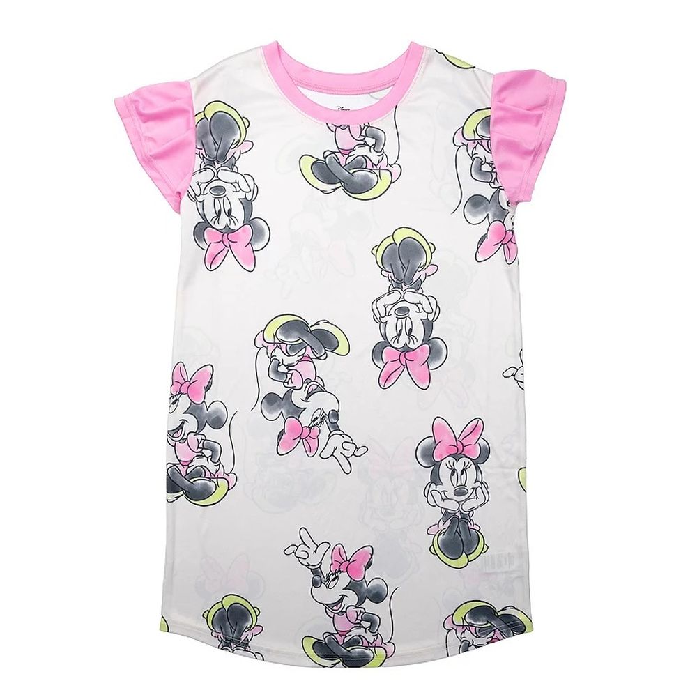 Your little Minnie Mouse fan will surely love this fun Disney Minnie Mouse Nightgown. The nightgown has a simple round neckline in pretty pink, short flutter sleeves, and features a print of Minnie Mouse characters against an ivory backdrop for a fun Disney style. Made with soft, lightweight satinet fabric, this nightgown offers all-night comfort and is easy to wear with its pullover style.