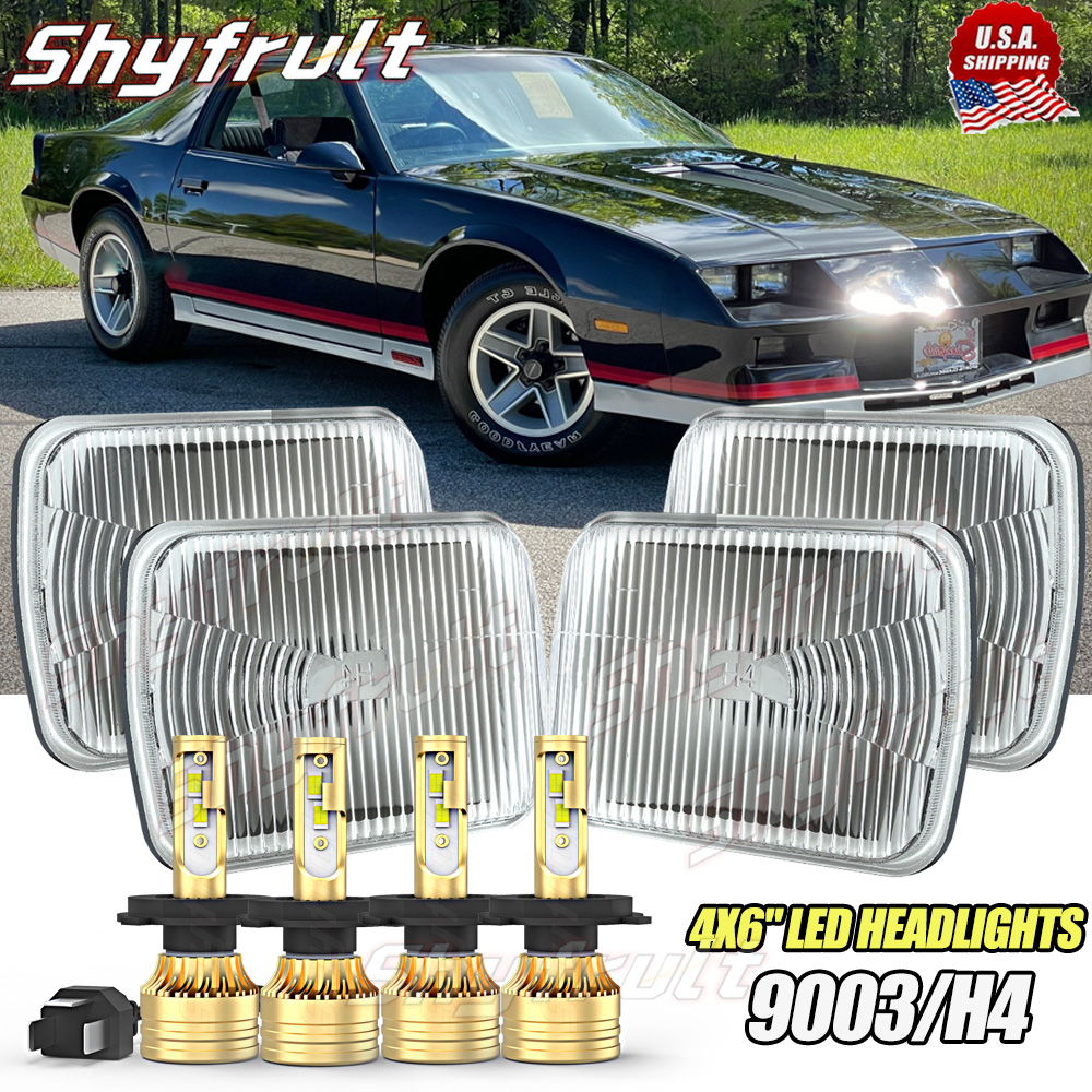 THIS LISTING IS FOR A NEW SET OF 4 - 4x6" STOCK STYLE GLASS LENS / METAL BACKSIDE H4 CONVERSION HEADLIGHTS WITH WHITE LED LIGHT BULBS. THIS SET INCLUDES 2 HIGH BEAM & 2 HIGH / LOW BEAM HEADLIGHTS. THESE HAVE THE ORIGINAL SHAPED PRONGS ON THE BACK SO THEY WILL PLUG RIGHT INTO YOUR ORIGINAL WIRING HARNESS PLUGS. THESE ARE BRIGHTER AND WHITER THAN THE STOCK STYLE INCANDESCENT SEALED BEAM HEADLIGHTS. IN RARE CIRCUMSTANCES, WIRING MODIFICATION MAY BE REQUIRED. THESE ARE FOR ANY CAR OR TRUCK THAT HAS 4 SQUARE 4x6" HEADLIGHTS.