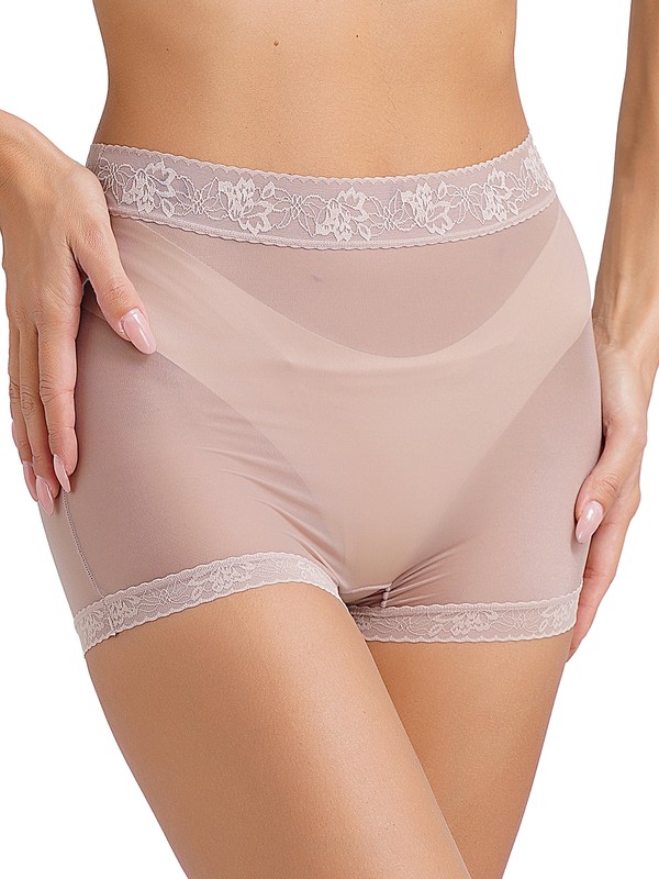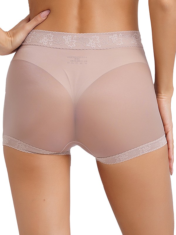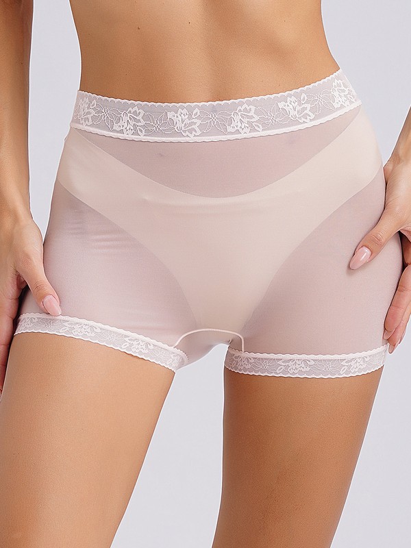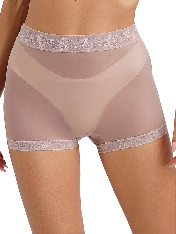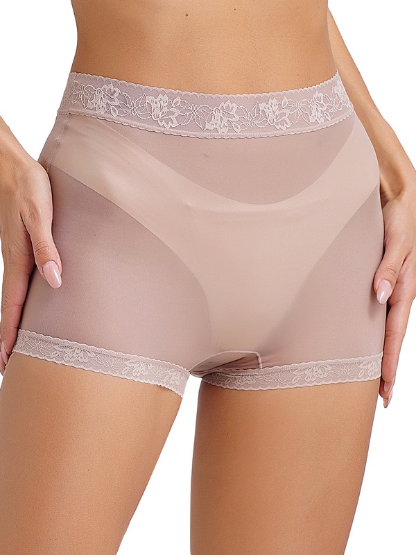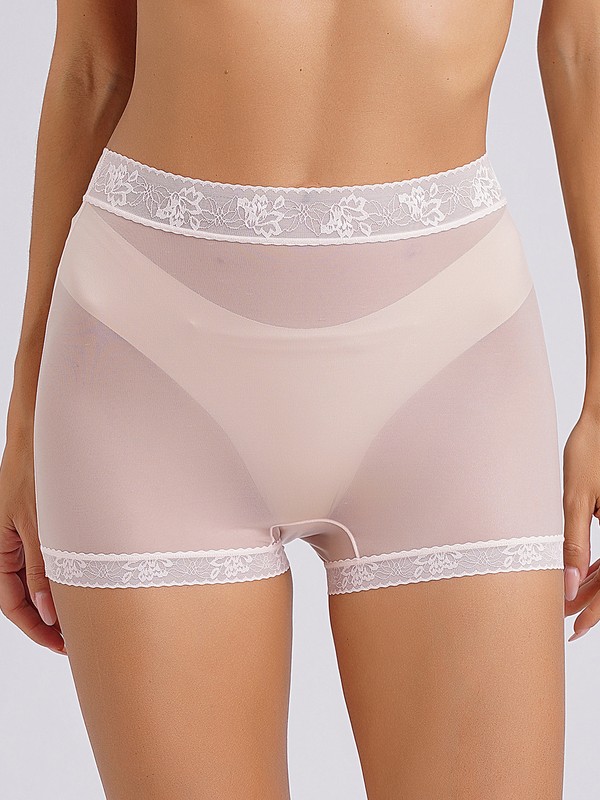 Women’s underwear is designed with boyshorts silhouette, see-through mesh with lace trims, high stretch fabric and solid color.