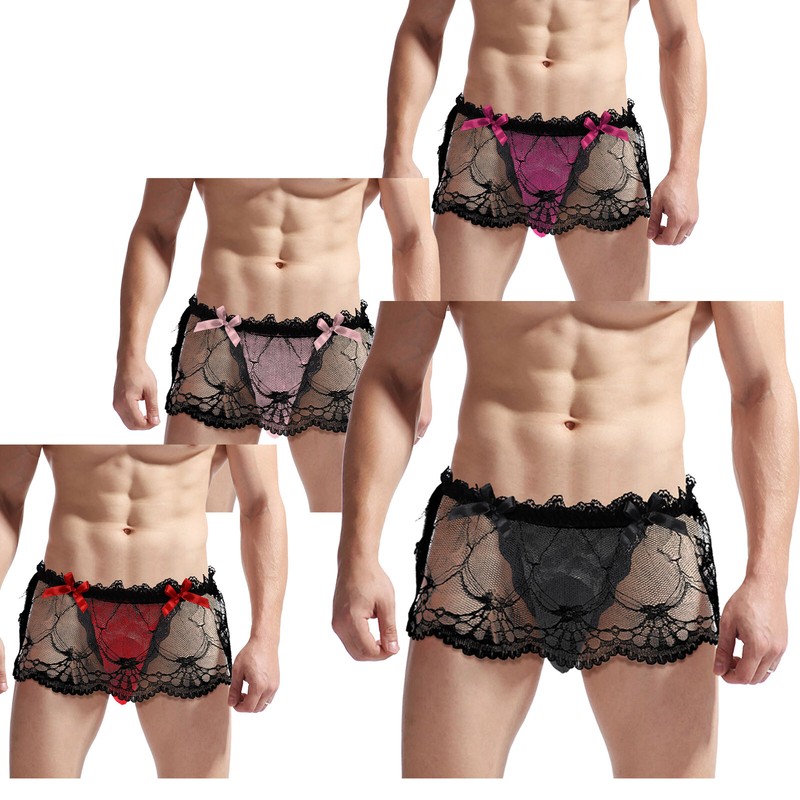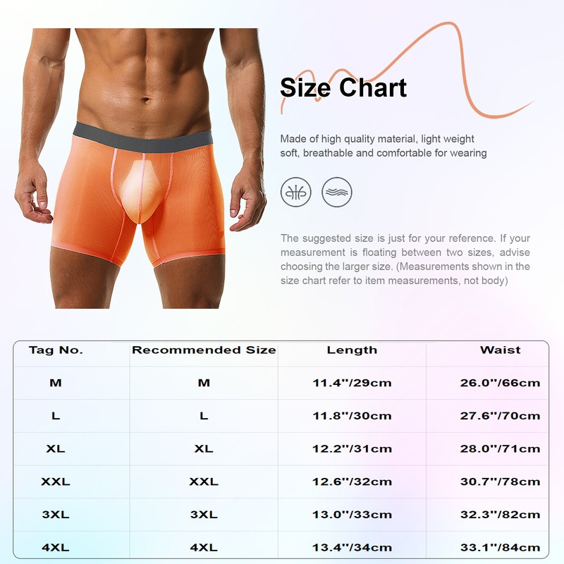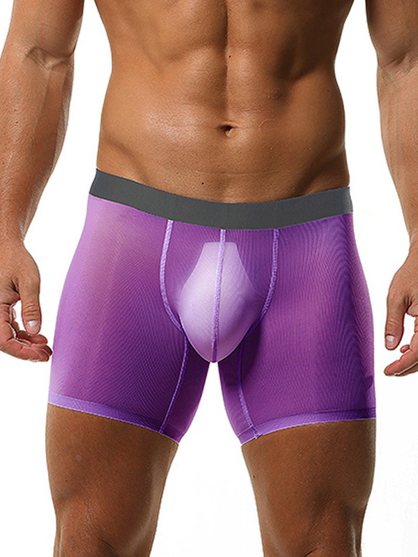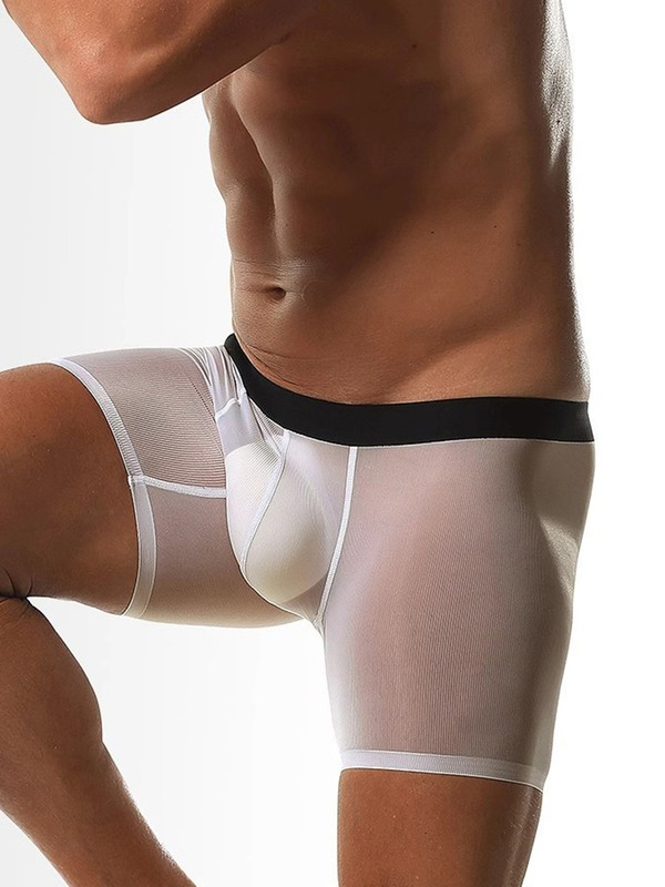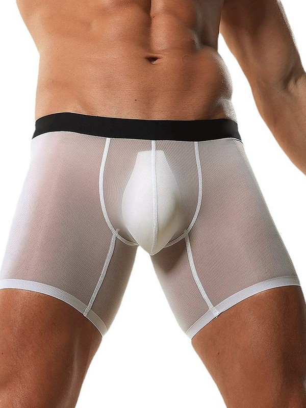 Designed with low waist, wide elastic waistband, bulge pouch and lengthened boxer shorts.