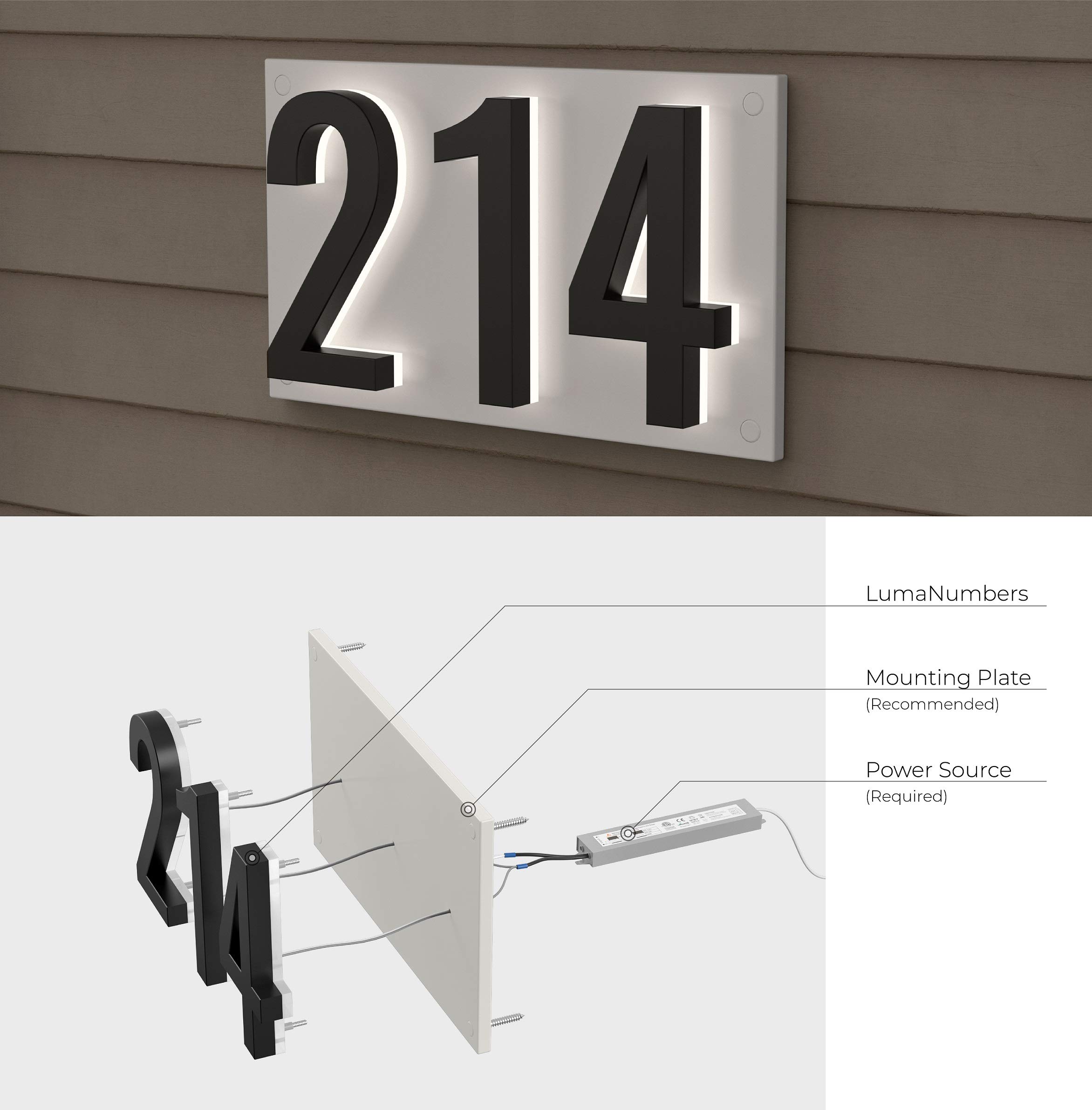 LN LUMANUMBERS Backlit LED Address Numbers made with Durable Stainless Steel. Low-Voltage Lighted House Numbers, 5-inch, Weather-Proof, Modern Illuminated Floating Numbers Our backlit LED house numbers require drilling and low voltage electrical work, so we recommend finding a professional. You will need to order the 24-Watt Power Source (sold separately see below). Our recommended mounting plate makes installation easier, helps keep your numbers level, and allows you to only drill 1 hole for electrical instead of 1 per number/letter. |