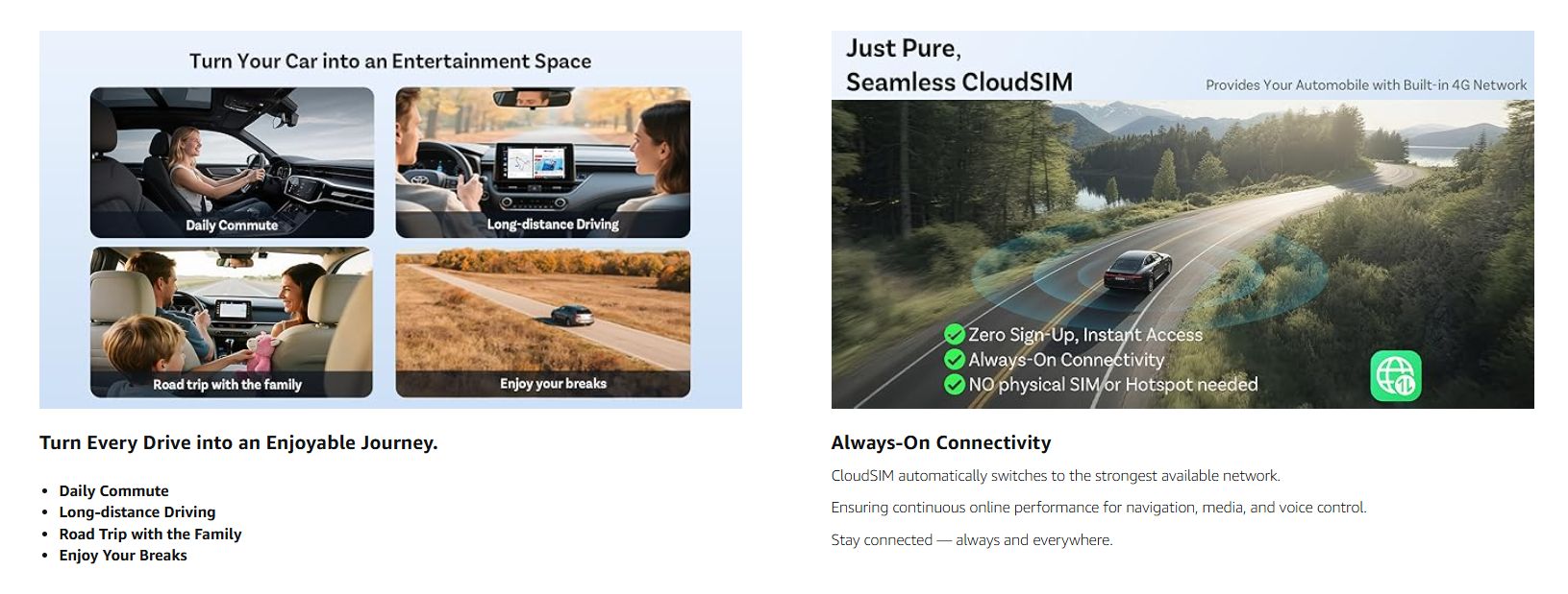 【Always Online with Global Connectivity】 Forget unreliable hotspots or expensive SIM cards. With CloudSIM + SIM card slot + WiFi, this smart AI box keeps you connected anywhere—whether on a cross-border road trip, checking local routes at a gas station, or streaming music in remote areas. A true upgrade over standard adapters, it makes global travel effortless.