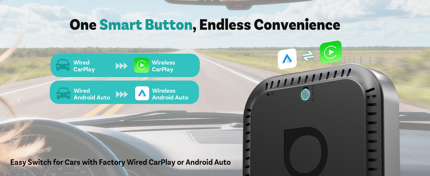 【Wireless CarPlay & Android Auto Adapter – Dual Support】 Switch freely between Apple CarPlay and Android Auto. Fully compatible with OEM steering wheel and touch controls for safer driving. No messy wires, no complicated setup—just plug, connect, and go.