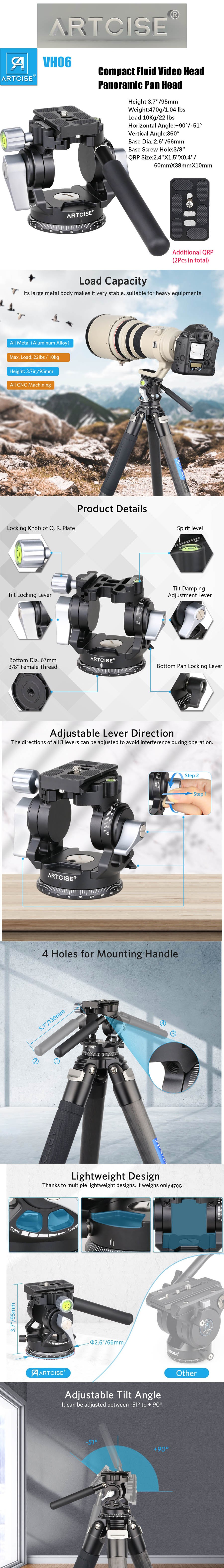 · 【Detachable handle】 this video tripod fluid head comes with a removable head handle. with 4 holes for mounting the handle so that left-handed people to control the professional video camera tripod movement easily.