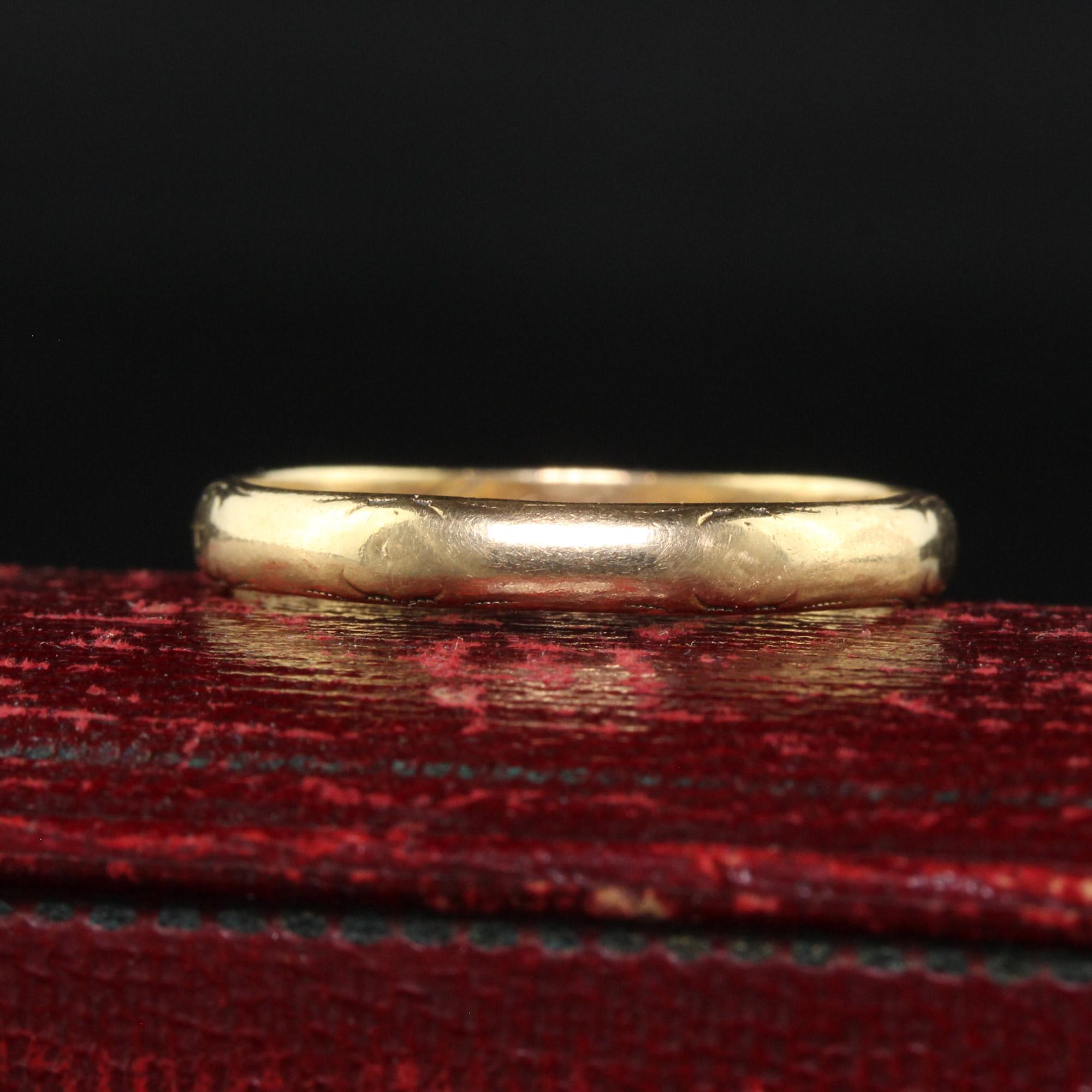 Beautiful Antique Art Deco 14K Yellow Gold Engraved Wedding Band - Size 10. This beautiful engraved wedding band is crafted in 14k yellow gold. The band features faint engravings around the entire ring and is engraved "R. B. H. - H. J. E. 6-19-37". The ring is in good condition and sits low on the finger.