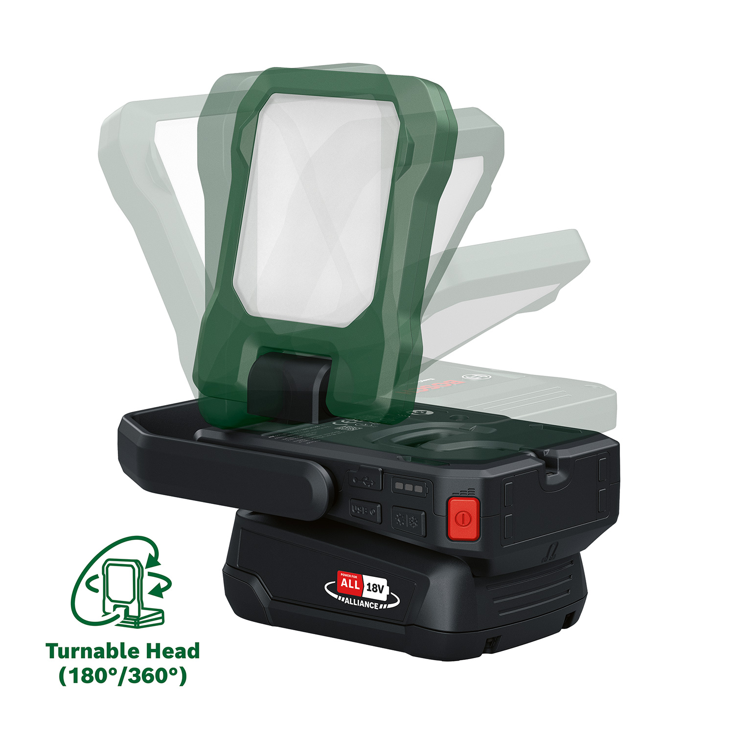 Multi-Use LED Light: Workshop, Outdoors, Camping. For superior camping, outdoor dining, or DIY illumination, the EasySpotLight 18V-400 is the ideal solution. Featuring a bright, maximum 400-lumen light, three-step brightness setting, and warm/cold white temperature settings, this light can be adapted quickly to suit the mood and task. It is easy to carry and hold, thanks to its handle and flexible design, and it is equipped with powerful magnets and a hook for mounting. The lights moveable head can be folded 180° and turned 360° to provide precise lighting where needed. This LED light also doubles up as a USB-C Power Bank, so smartphones and other devices can be charged up on the go. The tool belongs to the 18V POWER FOR ALL system. One battery can be used in all 18V POWER FOR ALL tools.