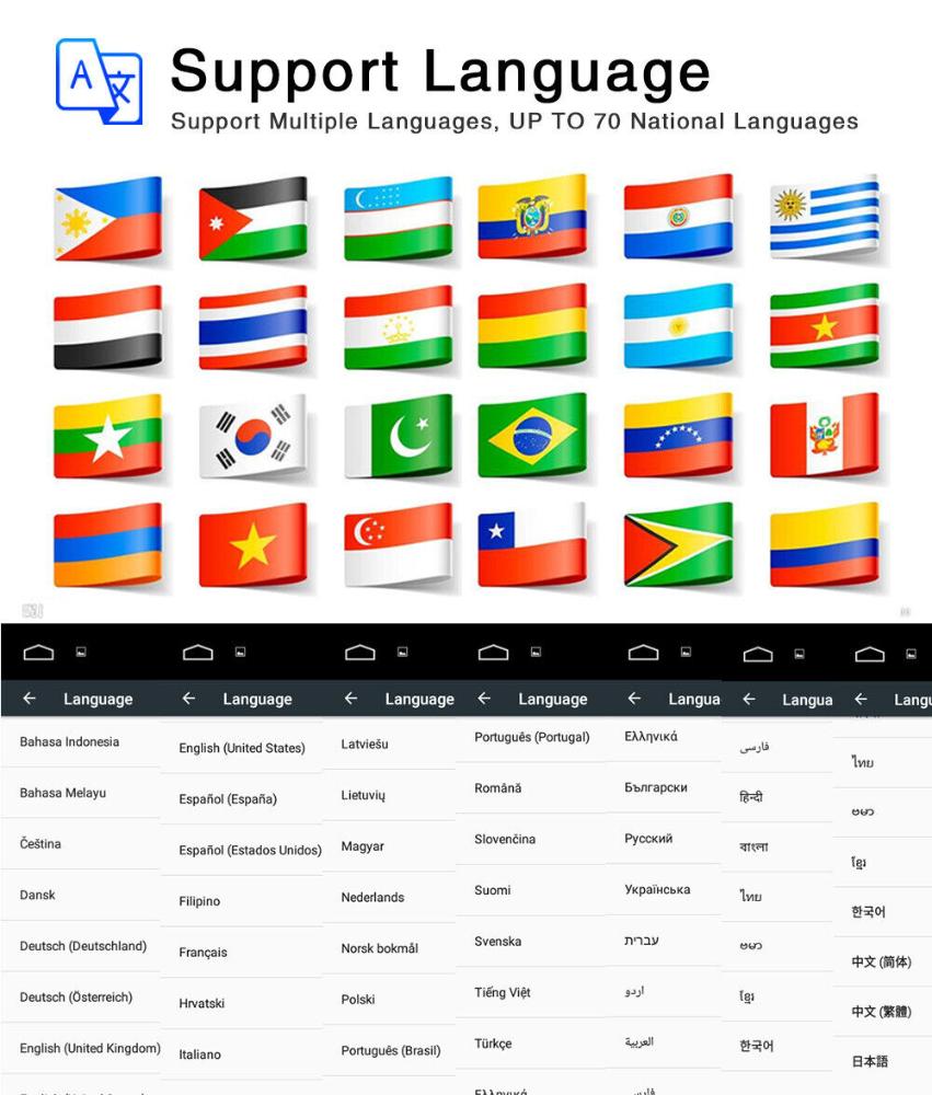 11. Multiple Languages Menu: Chinese (Simplified), Russian, Spanish, Turkish, Russian, Hebrew, Italian, Chinese (Traditional), Arabic, French, German, English, Portuguese, 70 languages including Korean, Thailand, etc.