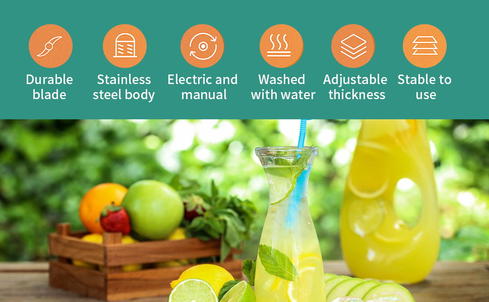 HIGH QUALITY MATERIALS---This electric fruit slicer is designed to last, with a body made from premium, food-grade stainless steel that ensures durability and long-lasting use. The blade, made with thickened aluminum alloy, is also robust and razor-sharp, allowing for effortless slicing of various fruits with precision. Additionally, the removable blade simplifies the cleaning process and helps maintain hygiene, providing you with a hassle-free way to keep your slicer in perfect condition.