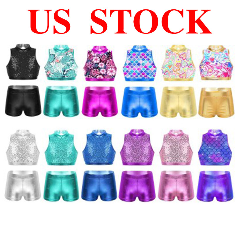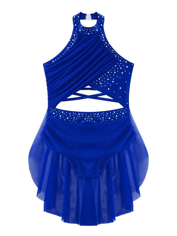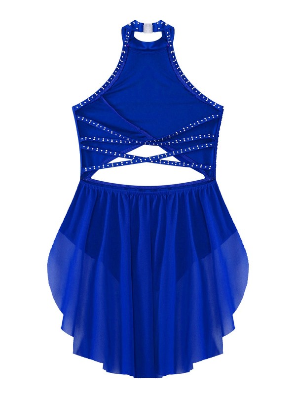 Kids girls’ sleeveless dance dress with rhinestones that sparkle under the light to brighten up any performance.