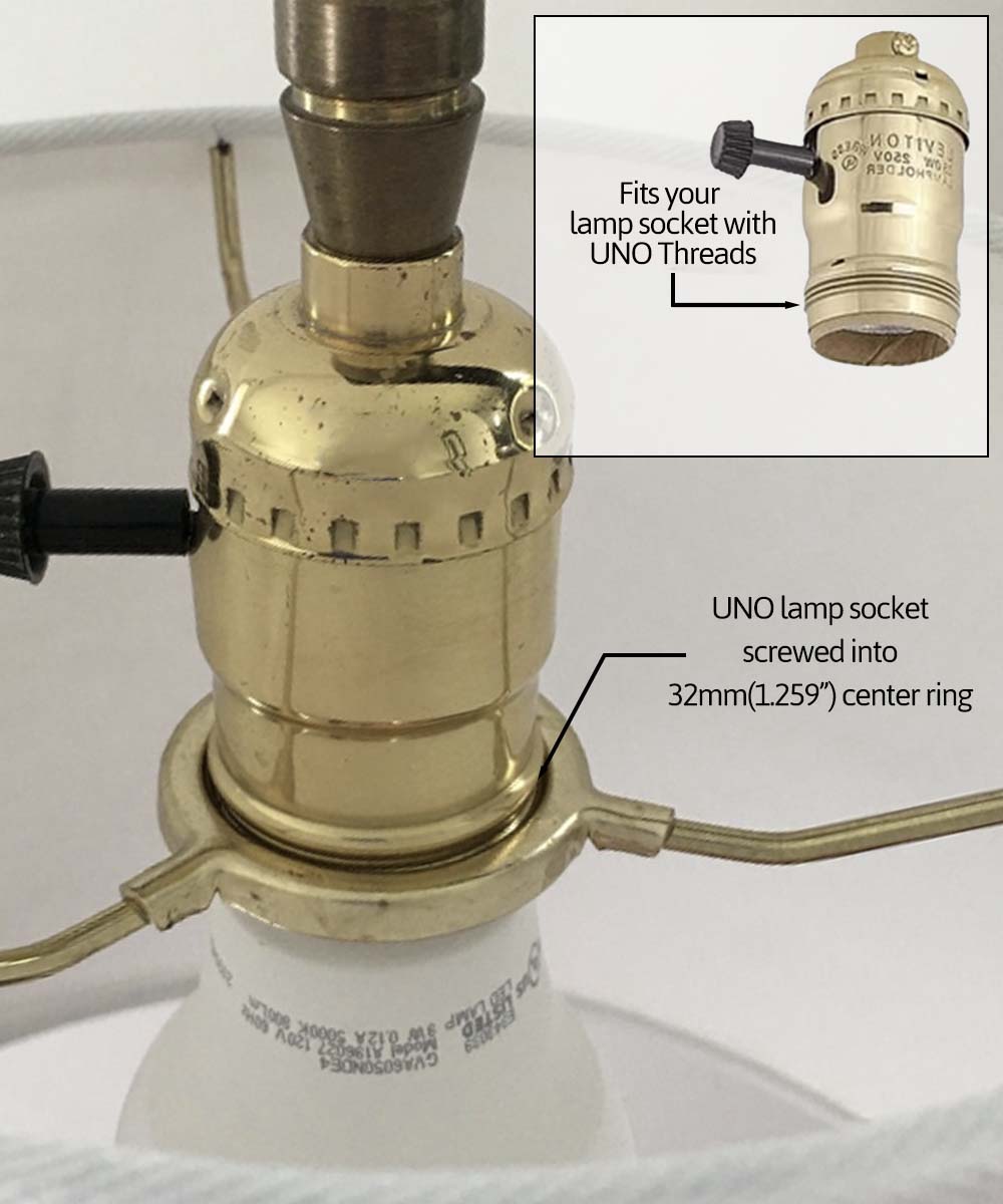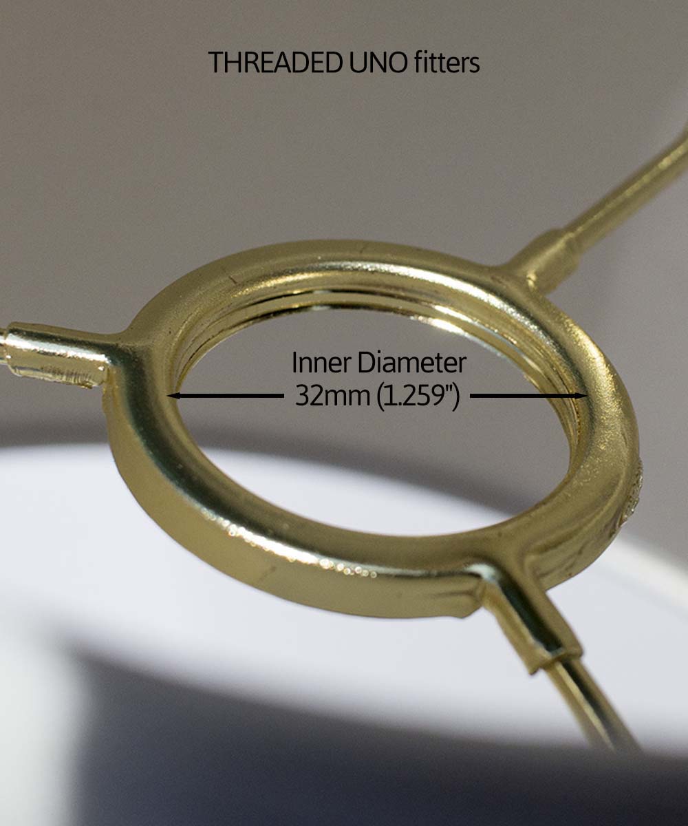 - UNO FITTER - Shade includes a THREADED UNO Fitter with a 1.259" Threaded inner diameter (32mm) This lampshade is designed to thread directly onto the brass socket of your traditional downbridge floor lamp. Please see images to verify this shade will fit your lamp. Shade features a 1.75"" Drop. (Note: Many new lamps are SLIP UNO fitter that does not have threads. If your brass socket does not have threading, or is plastic, this shade will not fit.)