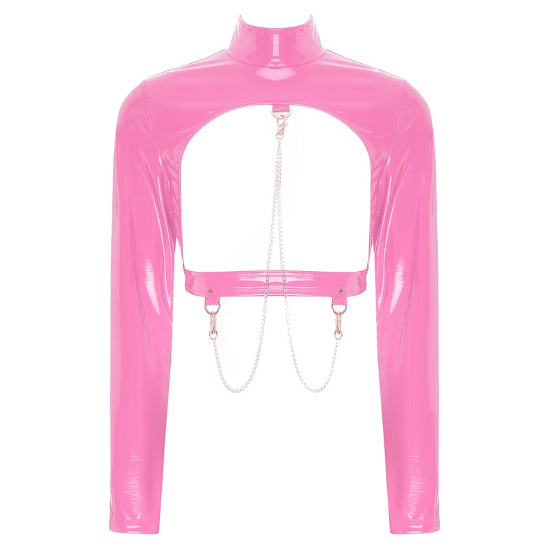 Women’s lingerie crop top designs with stand collar, long sleeve, back zipper closure and extensive hollow out in front, let you look hot.