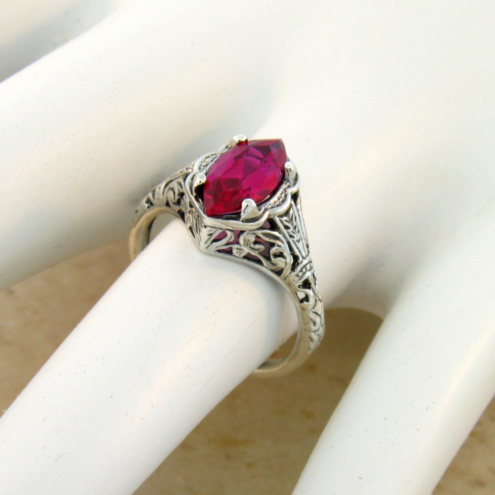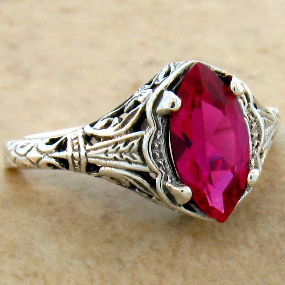 .925 Solid Sterling Silver Art Deco Style Ring. The Top Of The Ring Measures 3/8 Inches In Length. This Classic Antique Art Deco Period Reproduction Is A Real Treasure, Set With One High Quality 10 x 5 mm Marquise Cut Lab-Created 1.20 Carat Ruby Stone. Inspired By The Original Designs Of The Victorian To The Art Deco Period, 1836-1935. Item Is Stamped 925. Our Silver Is Genuine 925 Sterling Silver.