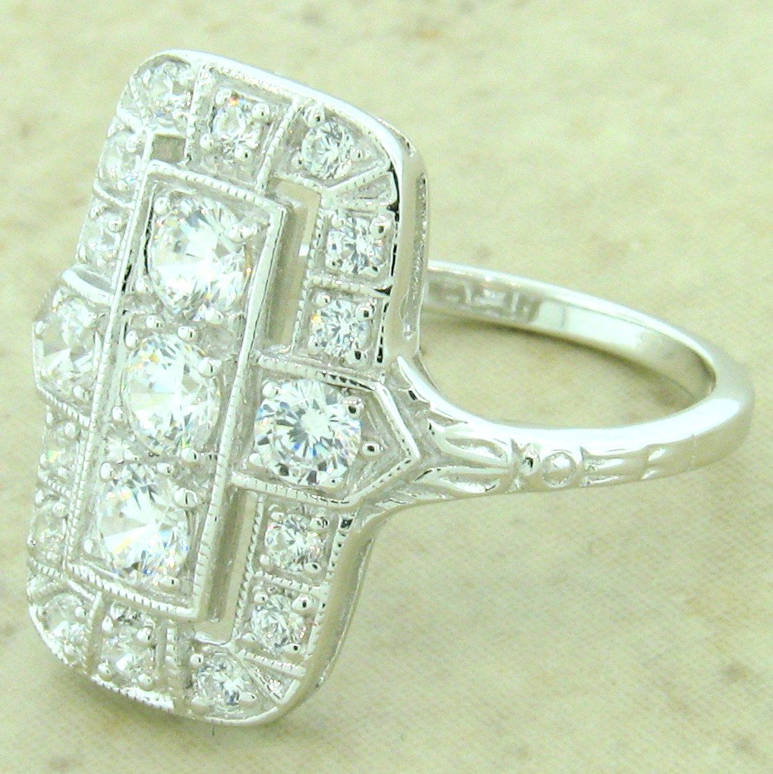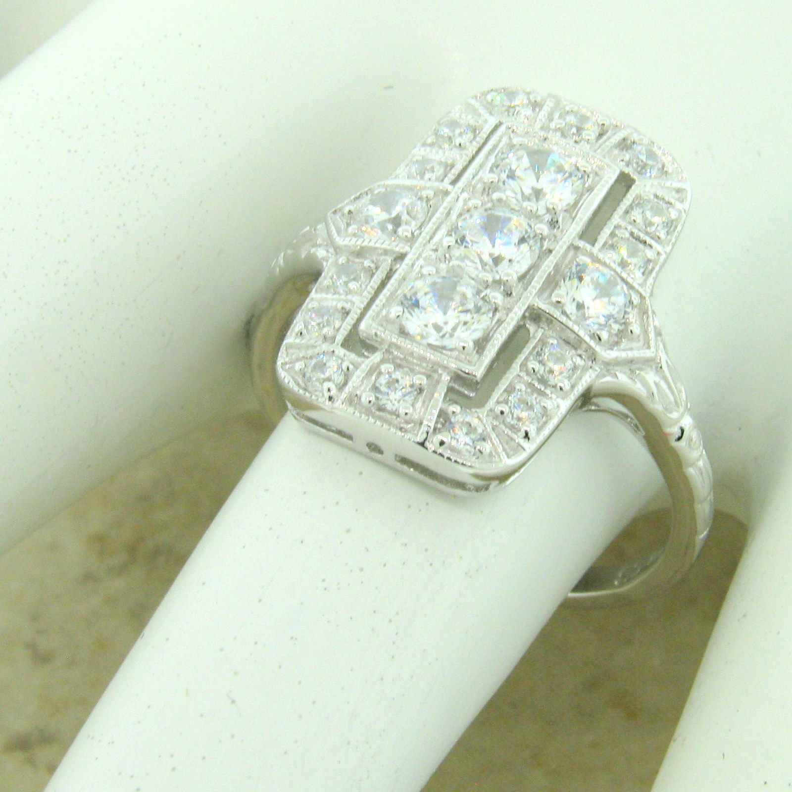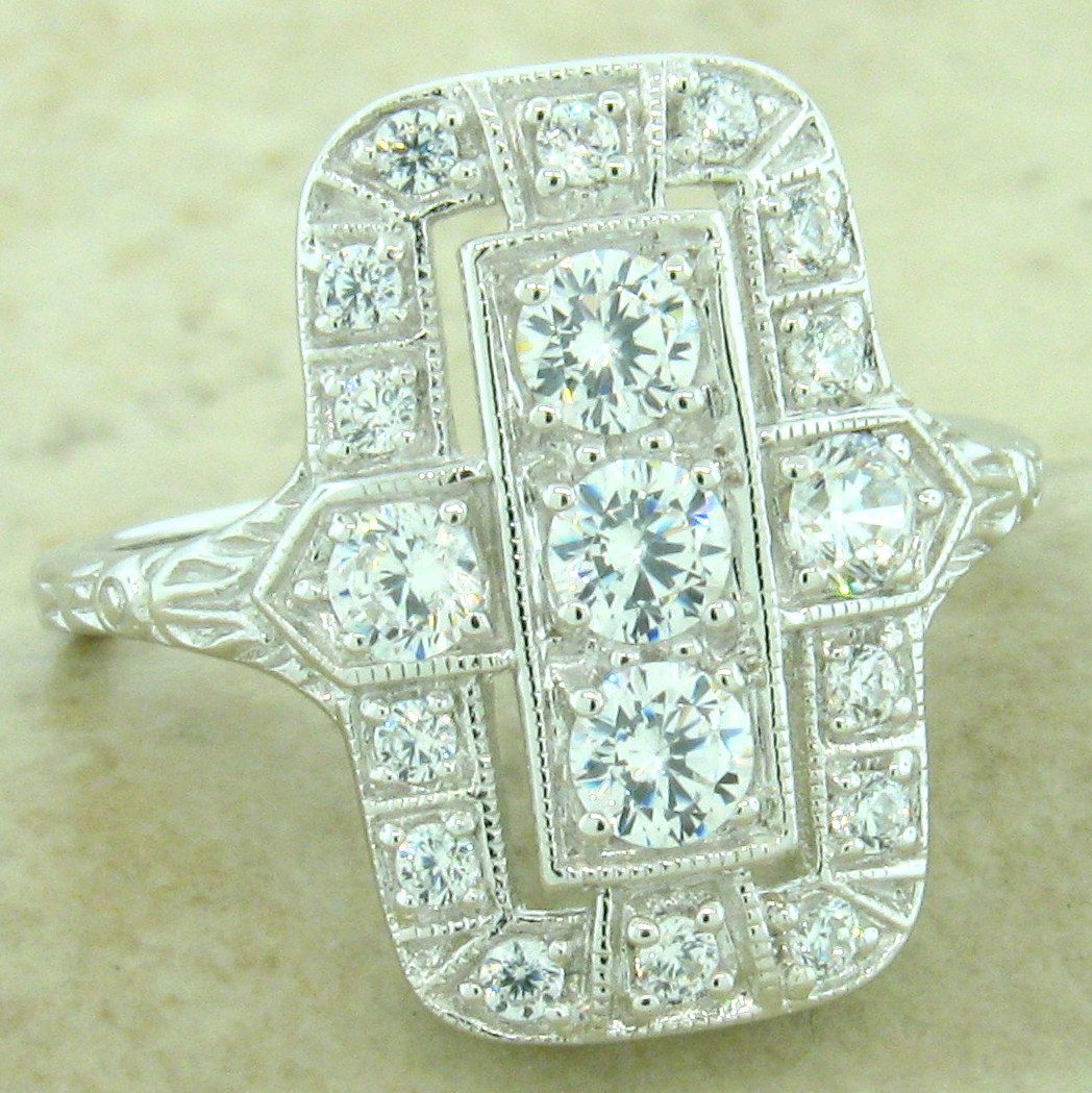 Art Deco Style .925 Solid Sterling Silver With Anti-Tarnish Rhodium Plating 1.79 Carat Cubic Zirconia Ring. The Top Of The Ring Measures Nearly 3/4 Inches In Length. Inspired By The Original Designs Of The Victorian To The Art Deco Period, 1836-1935. Item Is Stamped 925. Our Silver Is Genuine 925 Sterling Silver. Antique Style Vintage Design