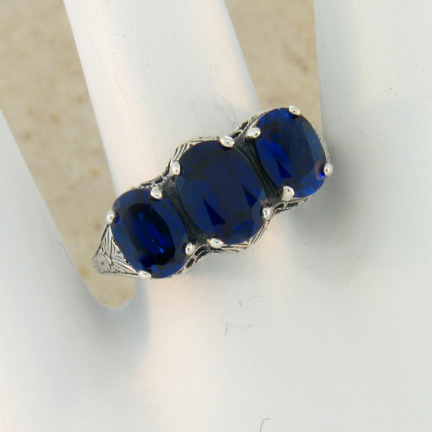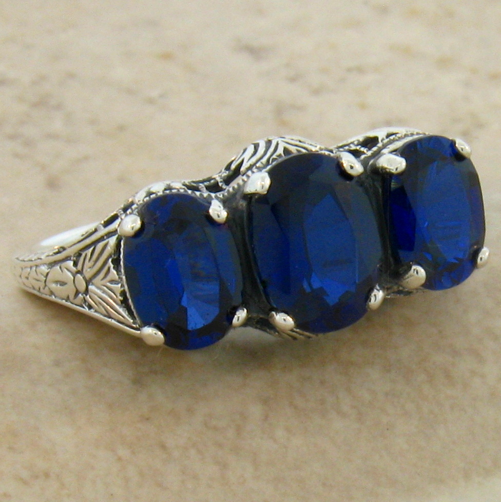 Royal Blue Art Deco Design Antique Style .925 Solid Sterling Silver 3 Stone Ring. The Top Of The Ring Measures 5/16 x 5/8 Inches. This Gorgeous Three-Stone Vintage Style Ring Is Set With 3 High Quality Lab-Created Sapphire Stones. Inspired By The Original Designs Of The Victorian To The Art Deco Period, 1836-1935. Item Is Stamped 925. Our Silver Is Genuine 925 Sterling Silver.