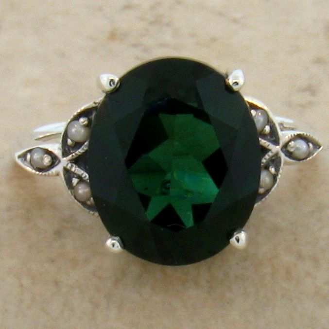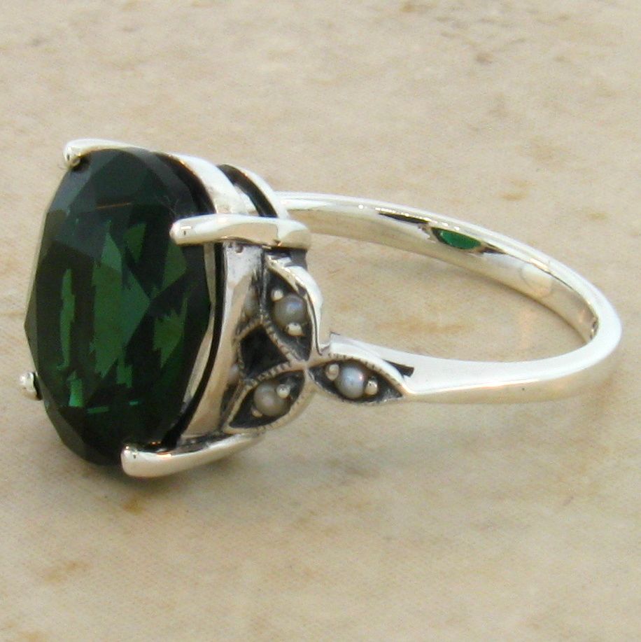 5 Carat Emerald Victorian Style .925 Sterling Silver Ring. The Top Of The Ring Measures Nearly 1/2 Inch In Length. This Is A Gorgeous Antique Victorian Reproduction Is Set With One High Quality 12 x 10 mm Simulated Emerald Stone & Has Freshwater Seed Pearl Accents. Inspired By The Original Designs Of The Victorian To The Art Deco Period, 1836-1935. Item Is Stamped 925. Our Silver Is Genuine 925 Sterling Silver.