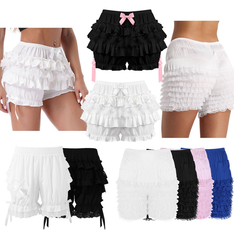 Women Lace Trim Layered Ruffle Bloomers Elastic Waistband Bowknot Decor Frilly Panties Shorts.