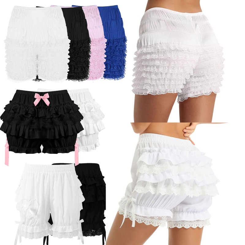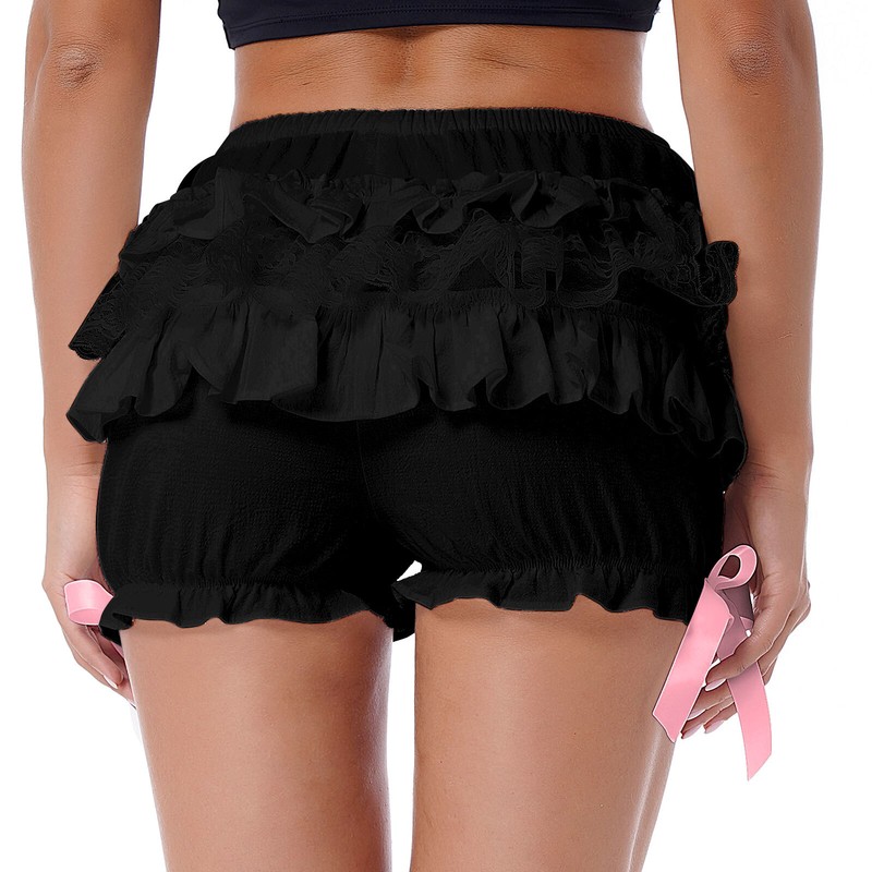 Women Lace Trim Layered Ruffle Bloomers Bowknot Frilly Panties Solid Color Shorts.