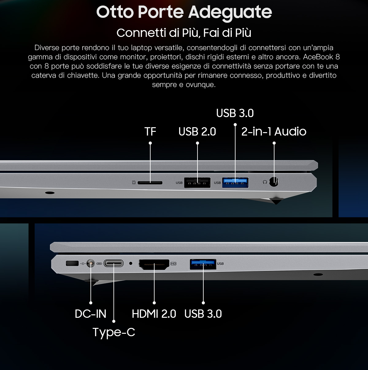 - 🌴🌴【Porti di connettività multifunzionali】Collegare di più, fare di più. Diverse porte rendono il vostro computer portatile versatile, consentendogli di collegarsi a un'ampia gamma di dispositivi come monitor, proiettori, dischi rigidi esterni e altro ancora. AceBook 8 con 8 porte può soddisfare le vostre esigenze di connettività senza dover portare con voi una serie di dongle. Una grande opportunità per rimanere connessi, produttivi e intrattenuti in qualsiasi momento e ovunque.