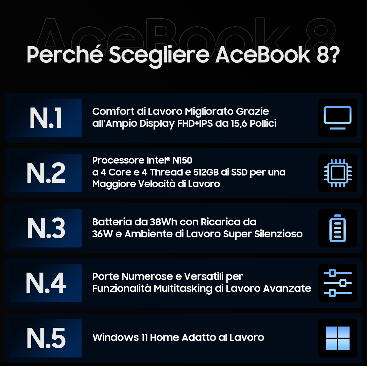 - 🍀🍀【Schermo Soinvolgente】Schermo più grande, migliore visibilità. Godetevi una navigazione coinvolgente e la visione di video su uno schermo da 15,6 pollici a cornice stretta con una risoluzione di 1920*1080. L'Acebook8 supporta anche lo sblocco facciale su schermo e la visualizzazione multischermo, in modo da poter partecipare a una videoconferenza mentre più schede vengono eseguite in background per una maggiore comodità. È un portatile che unisce prestazioni ed estetica.