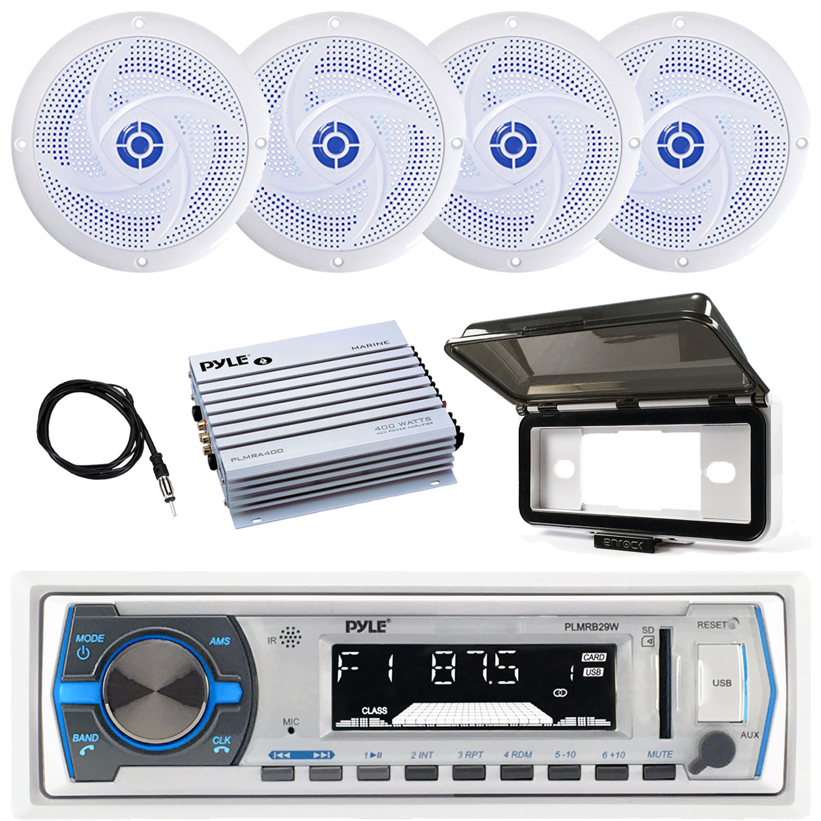 Pyle PLMRB29W Single-DIN Marine Bluetooth MP3 In-Dash Stereo White Receiver W/White Cover, 4x 6'' 240W Max Low Profile 2-Way Blue Flashing RGB LED White Speakers, 4-Channel Amplifier, Radio Antenna
