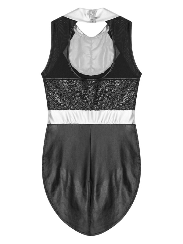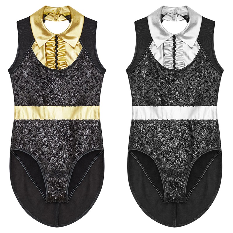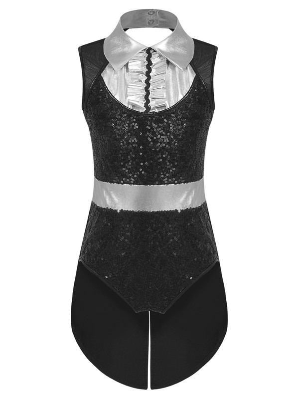 A lapel collar sleeveless open back sequins circus ringmaster magician costume bodysuit for child size.
