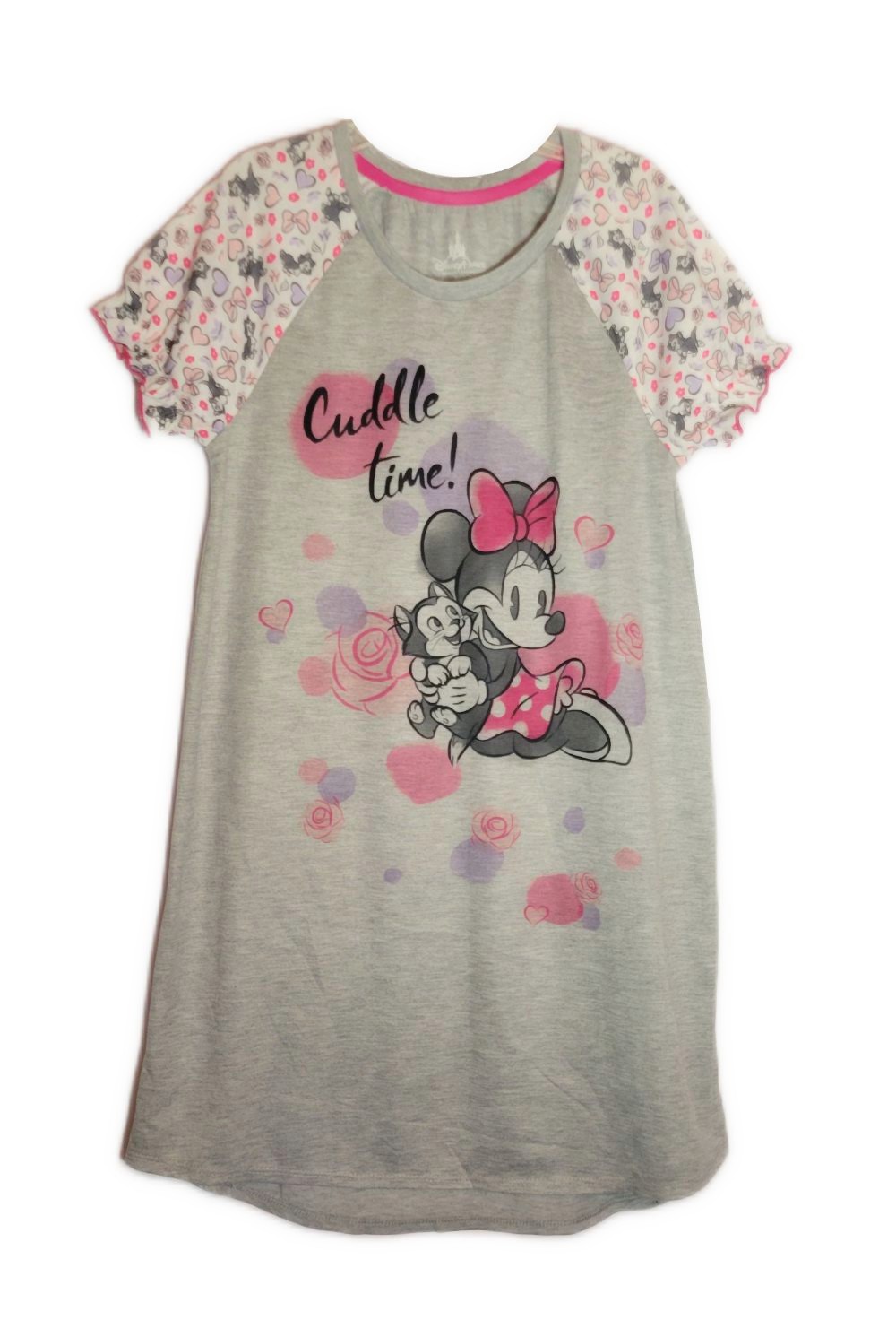 It's Minnie and her best feline friend Figaro in a delightful 'Cuddle Time!' theme with pink and purple dots, roses, and hearts in the background, sure to bring a smile to your child's face.