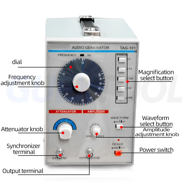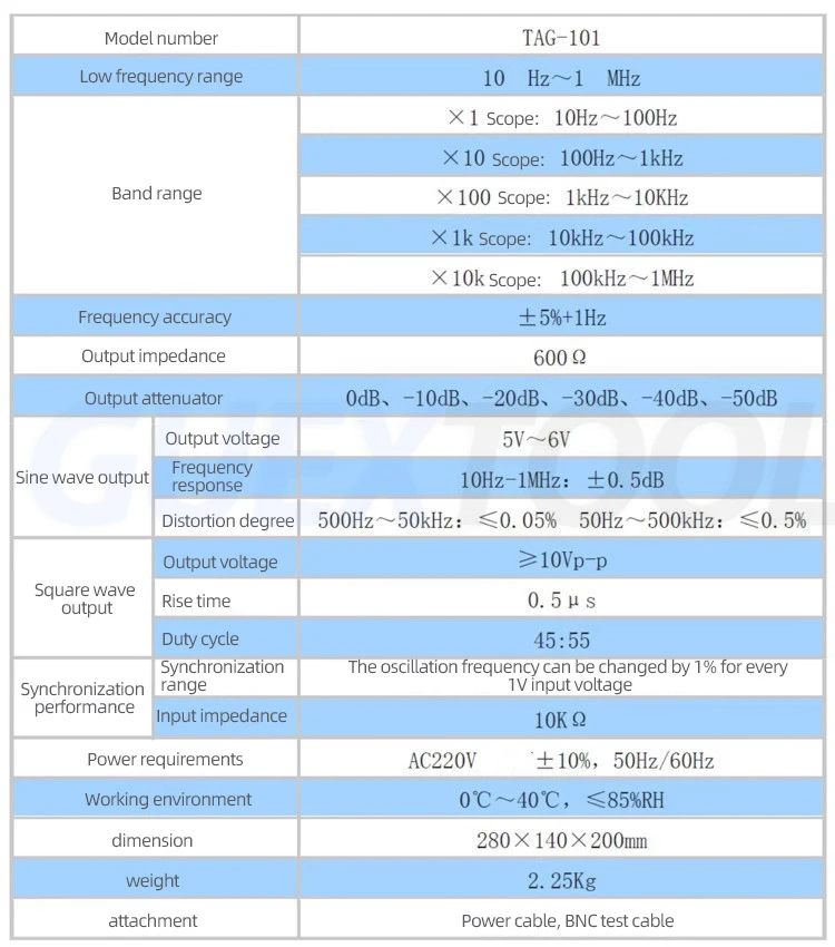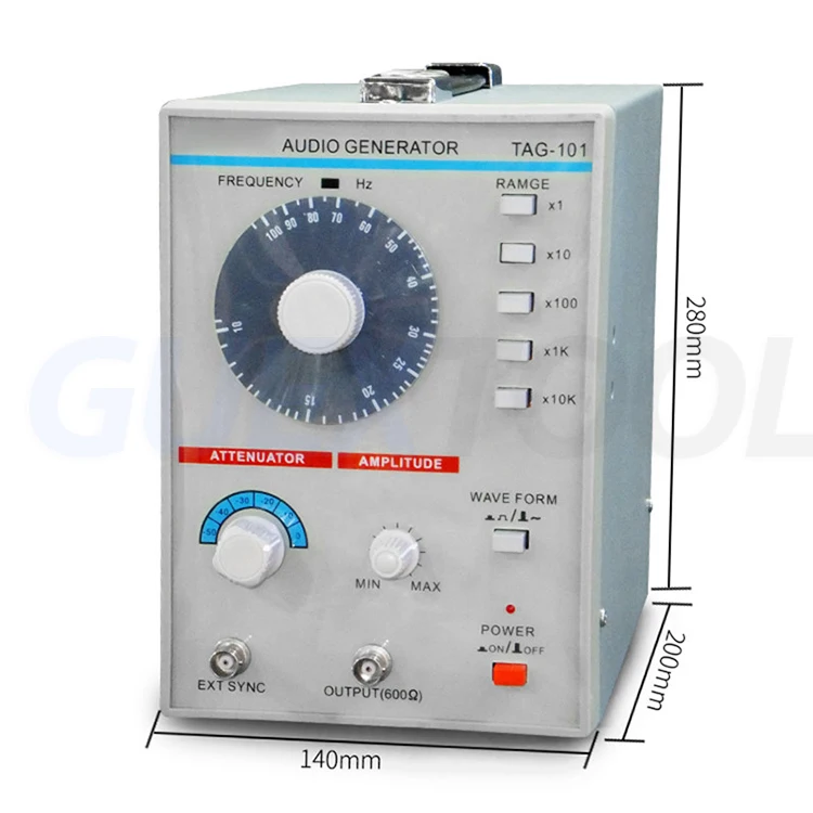 The TAG-101 low frequency signal generator can generate signals from 10 Hz to 1 M Hz, and the output distortion is very small. The output voltage gradually attenuates from 0 dB to 60 dB and gradually attenuates to 10 dB. As a signal source, it is welcomed by production lines, amateurs, maintenance, etc. At the same time, the output signal is synchronized with the terminal, and the control signal can accurately control the smallest strong signal.